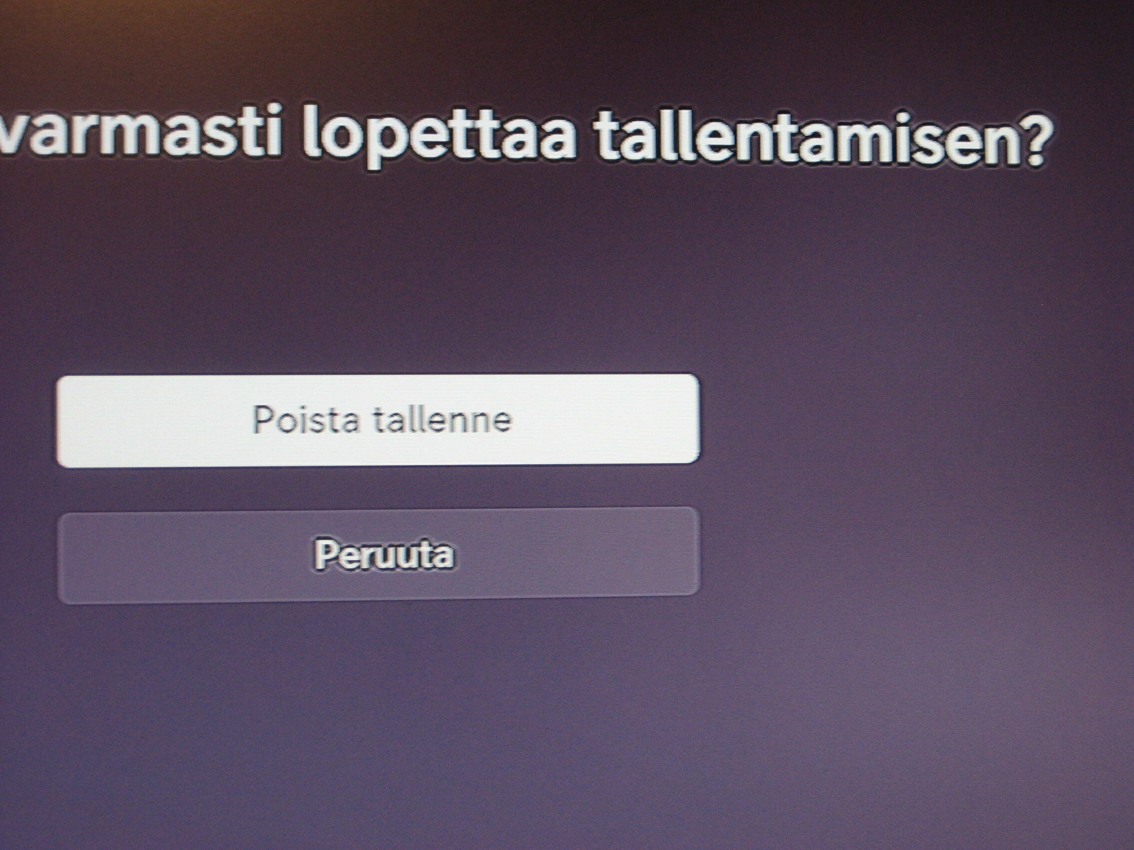 “haluatko varmasti lopettaa tallentamisen?” Poista tallenne ja peruuta - painikkeet. ei onneksi lopeta tallentamista.