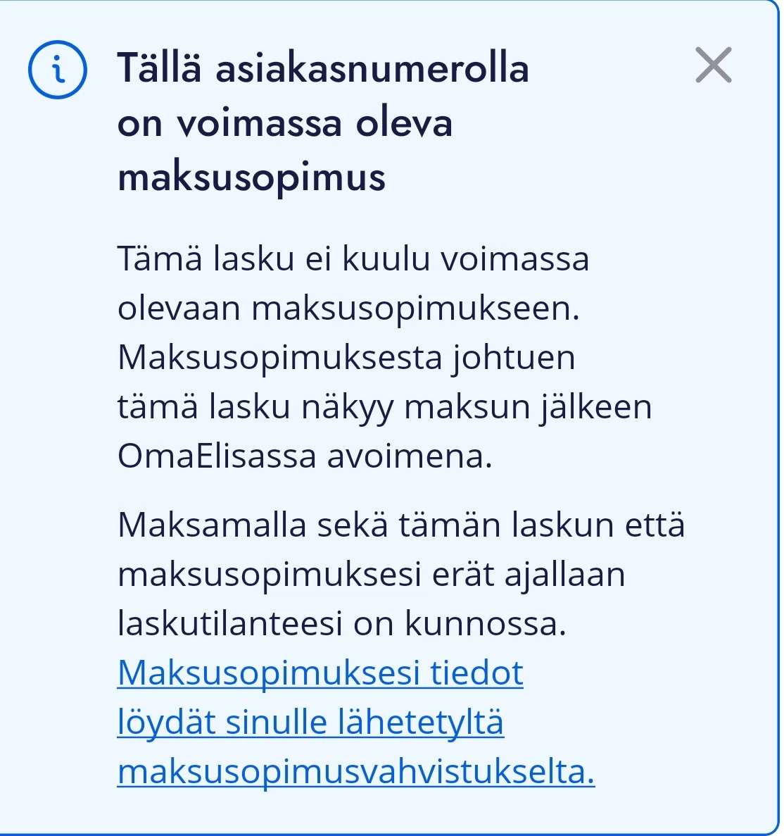 Harmi, että laskun maksu OmaElisa-sovelluksessa on takunnut. Äkkiseltään kuulostaa siltä, että palaaminen laskun maksusta OmaElisaan on jollain tapaa keskeytynyt tai häiriintynyt. Jos maksu on kuitenkin tililtäsi lähtenyt, kuittaantuu lasku OmaElisa-sovellukseen maksetuksia muutamassa pankkipäivässä viimeistään.