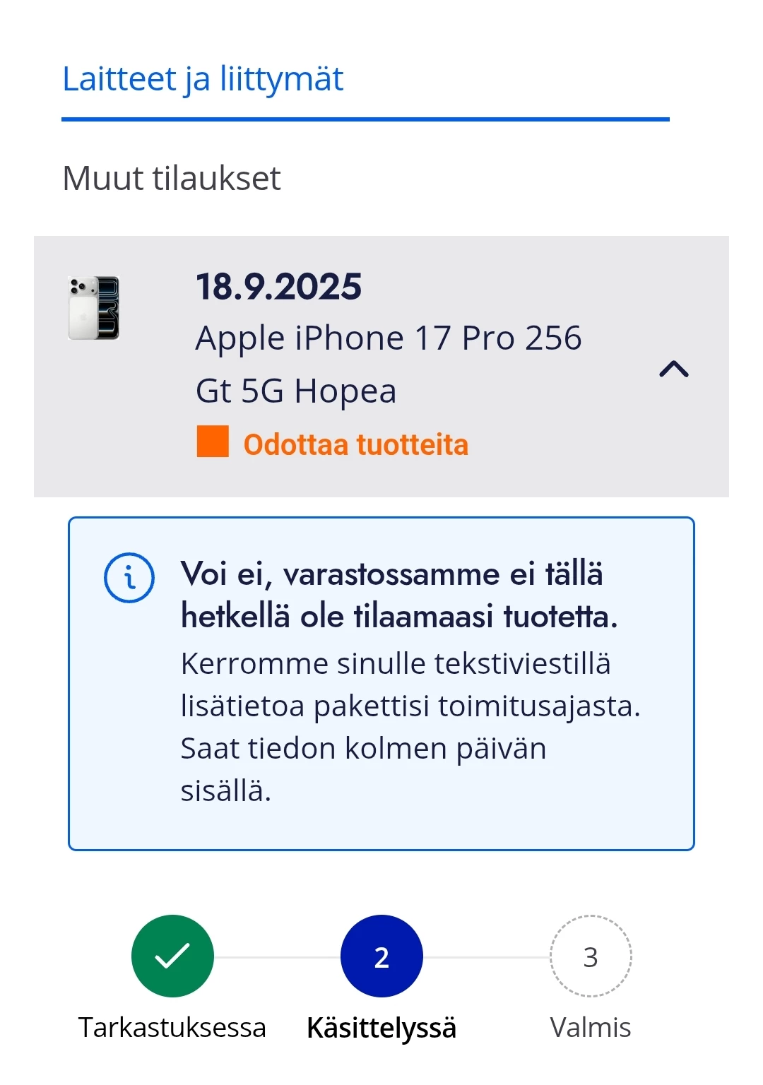 Laitteita toimitetaan yhdestä toimitusjonosta tilausjärjestyksessä. Kun tilauksesi on käsitelty, siirtyy se toimitusjonoon.