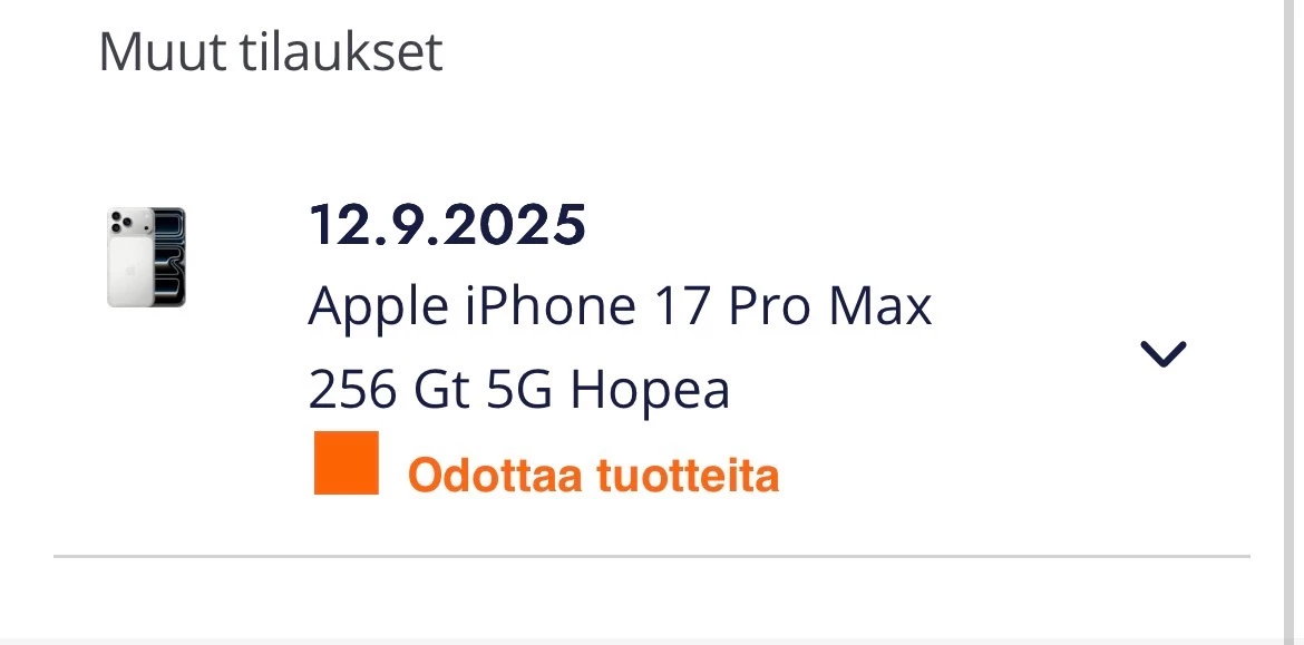 Tilausjono ei näköjään etene ihan järjestyksessä kun vastaava sininen 17pro on edelleen käsittelyssä. Tilausvahvistus 15.9 klo 10.48 😅
