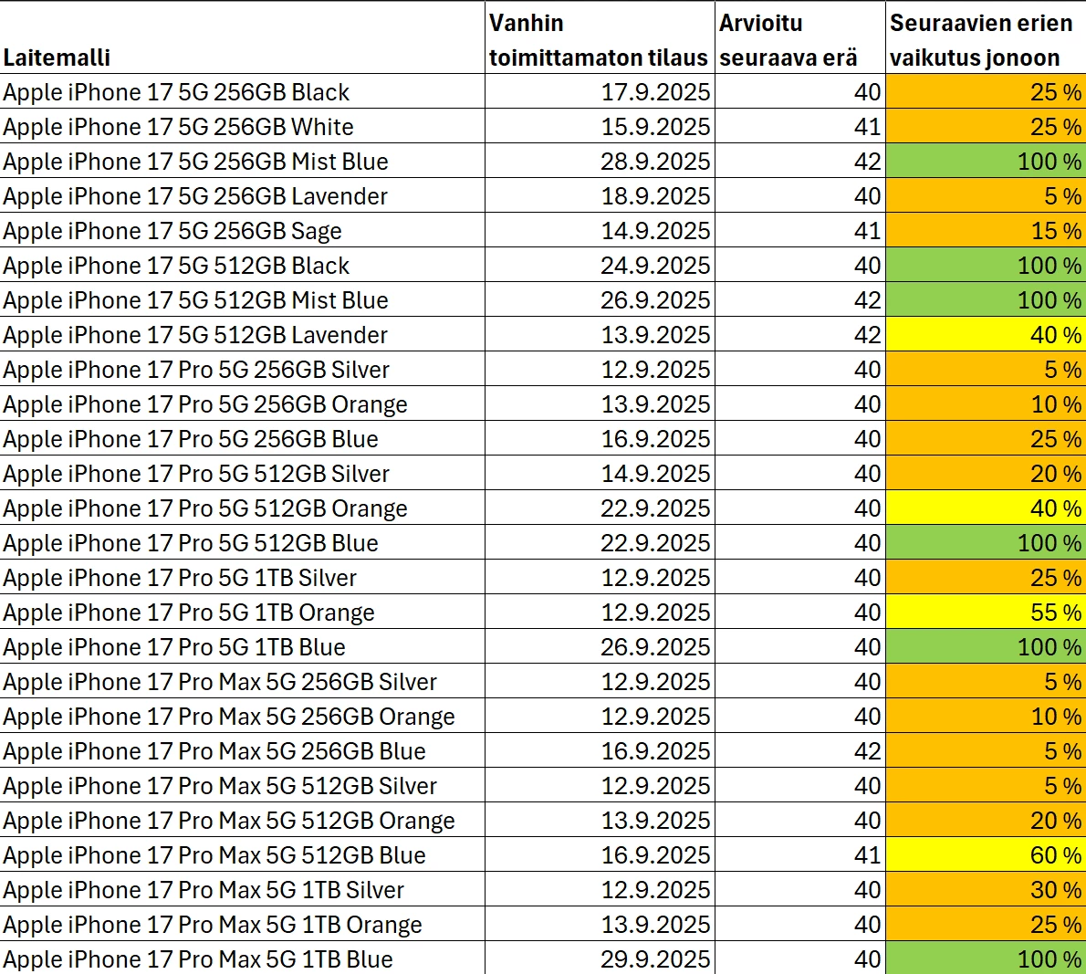 Eihän sillä enää ole suurtakaan merkitystä, täällä pystytään kertomaan että esim pro max 256 orangen viimeinen toimittamaton tilaus on 12.9. Ja uusia tulee: joskus