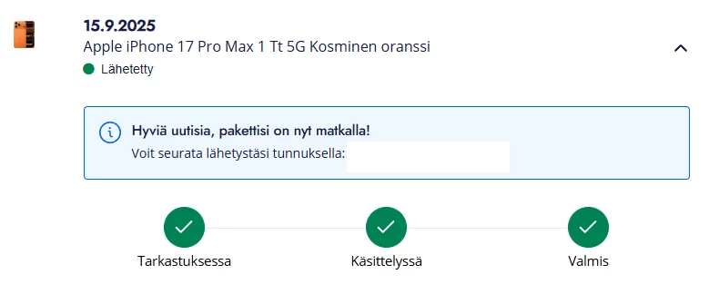 Olin yhteydessä asiakaspalveluun, kun 15.9 tilattu sininen 17 pro 256 ei ollut liikkunut vaikka taulukko kertoi muuta. Puhelin odotti suojakuorta, joka oli jälkitoimituksessa. Luulin tilausta tehdessäni valinneeni, että osa tuotteista saa tulla jälkitoimituksena, mutta ilmeisesti sitten en. Asiakaspalvelu siirsi kuoren erilleen jälkitoimitettavaksi pyynnöstäni. Oletin jo, että jouduin täysin jonon perälle, mutta pari tuntia tämän jälkeen tulikin jo ilmoitus, että puhelin on postin käsittelyssä.