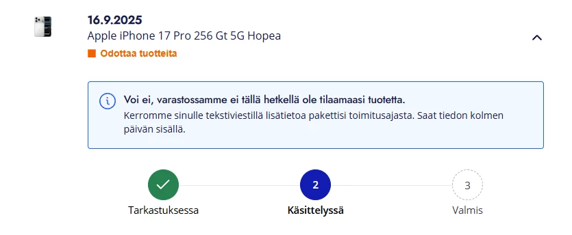 Laitteita toimitetaan yhdestä toimitusjonosta tilausjärjestyksessä. Kun tilauksesi on käsitelty, siirtyy se toimitusjonoon.