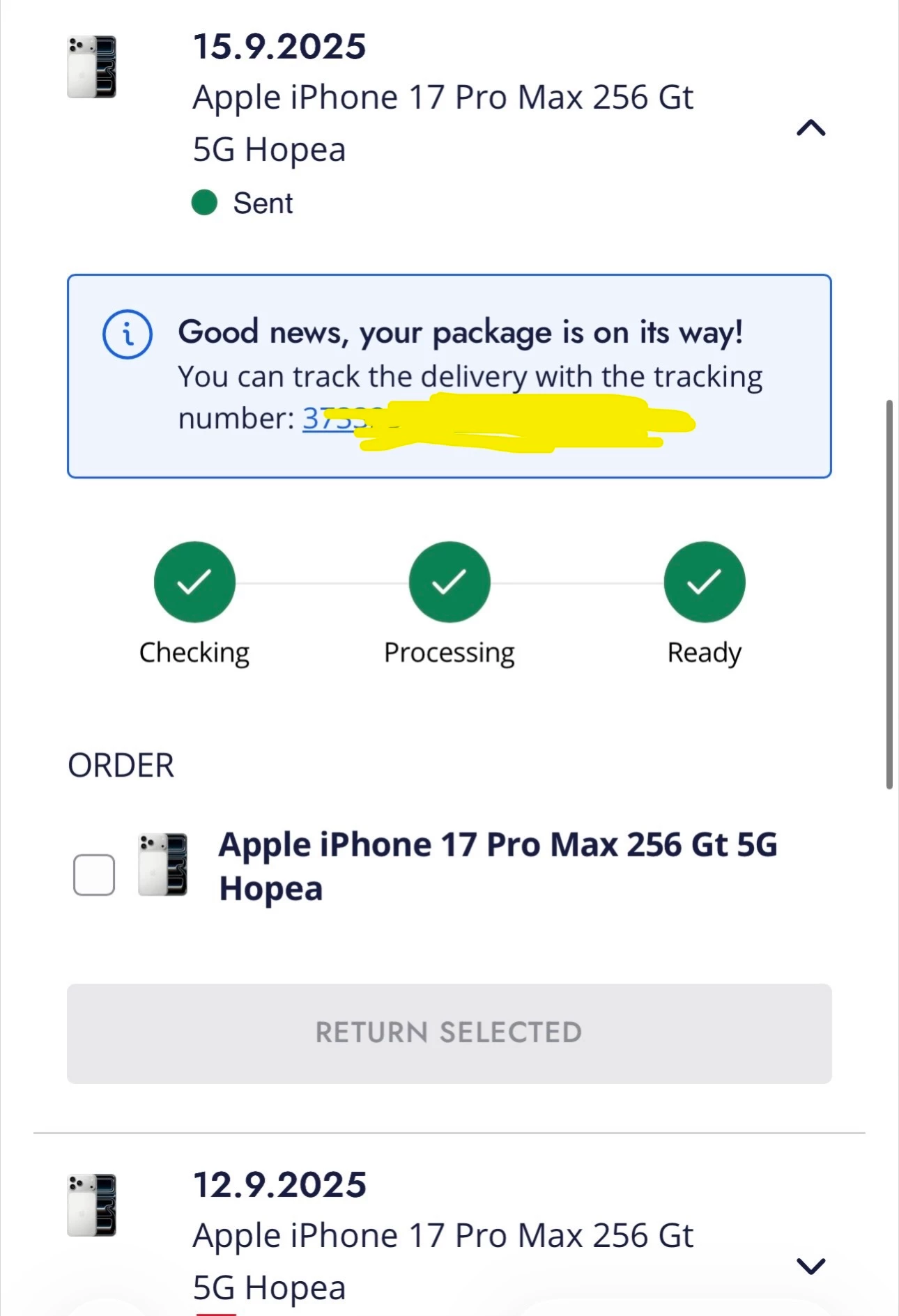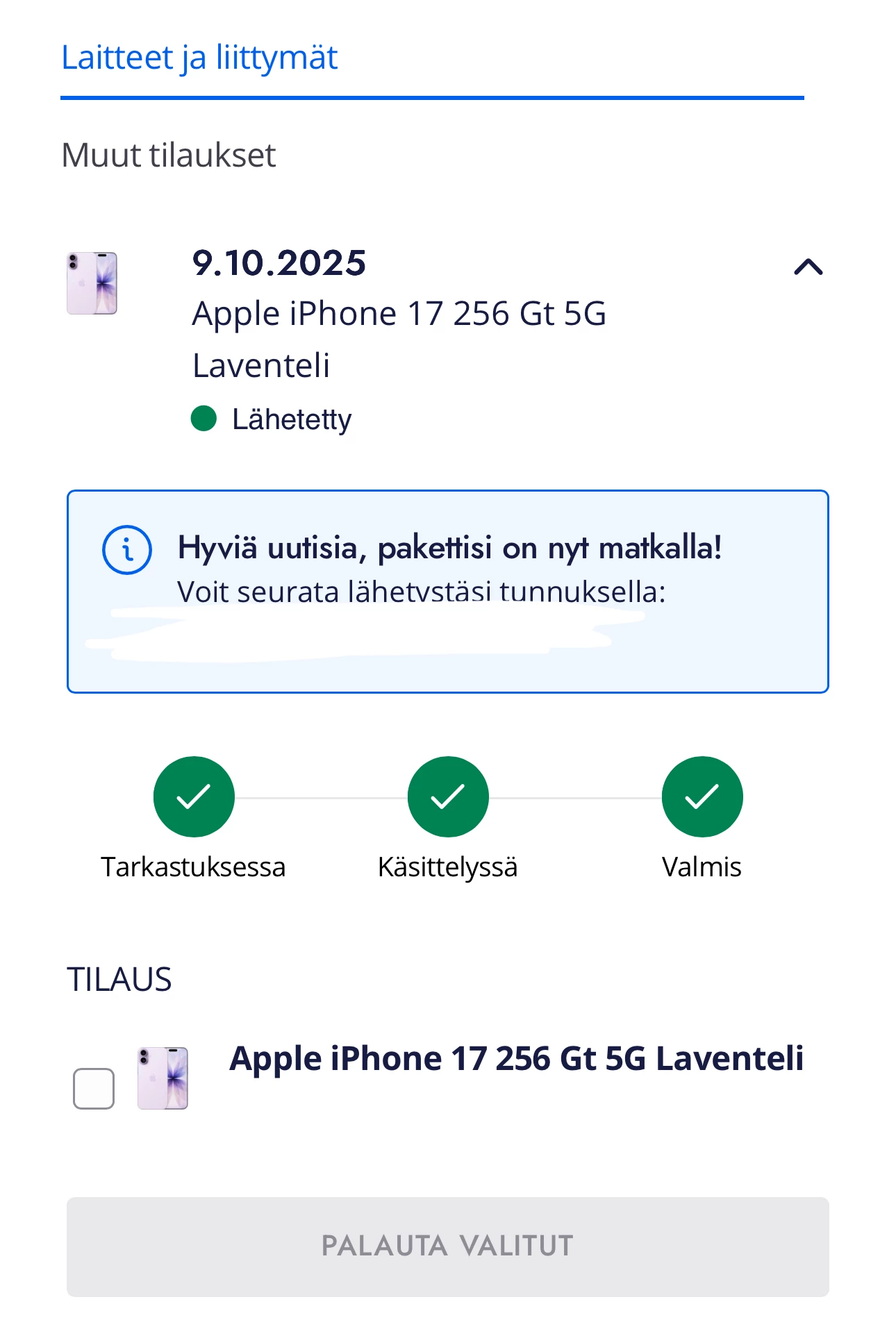 Laitteita toimitetaan yhdestä toimitusjonosta tilausjärjestyksessä. Kun tilauksesi on käsitelty, siirtyy se toimitusjonoon.