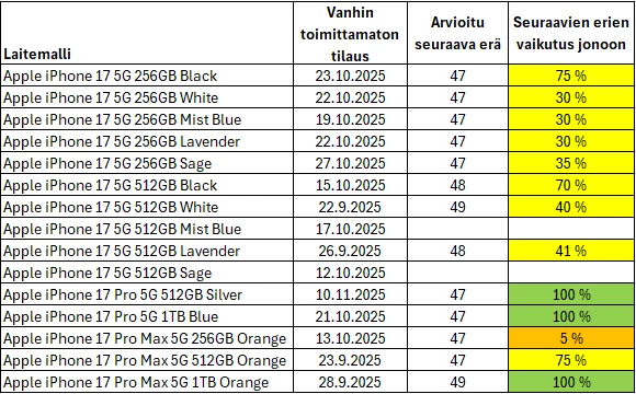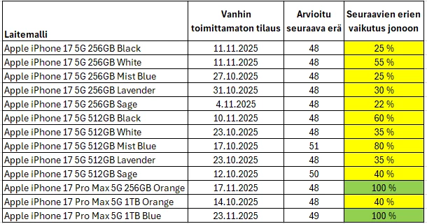 Toimitus- ja saatavuustilanteen päivitetty tieto 18.11.2025