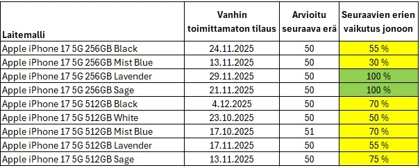 Laitteita toimitetaan yhdestä toimitusjonosta tilausjärjestyksessä. Kun tilauksesi on käsitelty, siirtyy se toimitusjonoon.