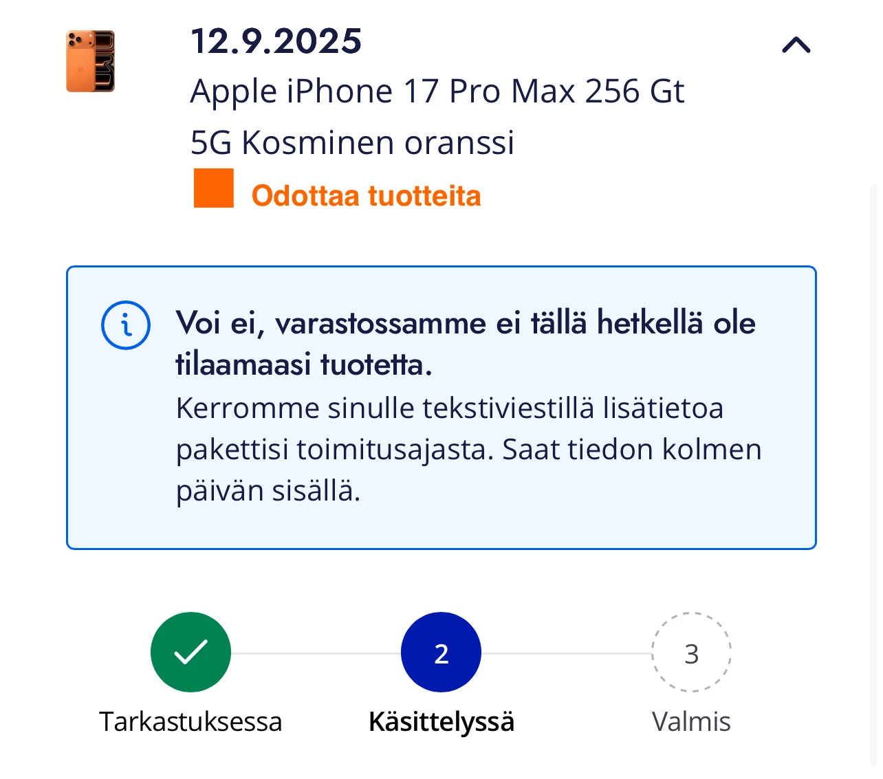 Laitteita toimitetaan yhdestä toimitusjonosta tilausjärjestyksessä. Kun tilauksesi on käsitelty, siirtyy se toimitusjonoon.