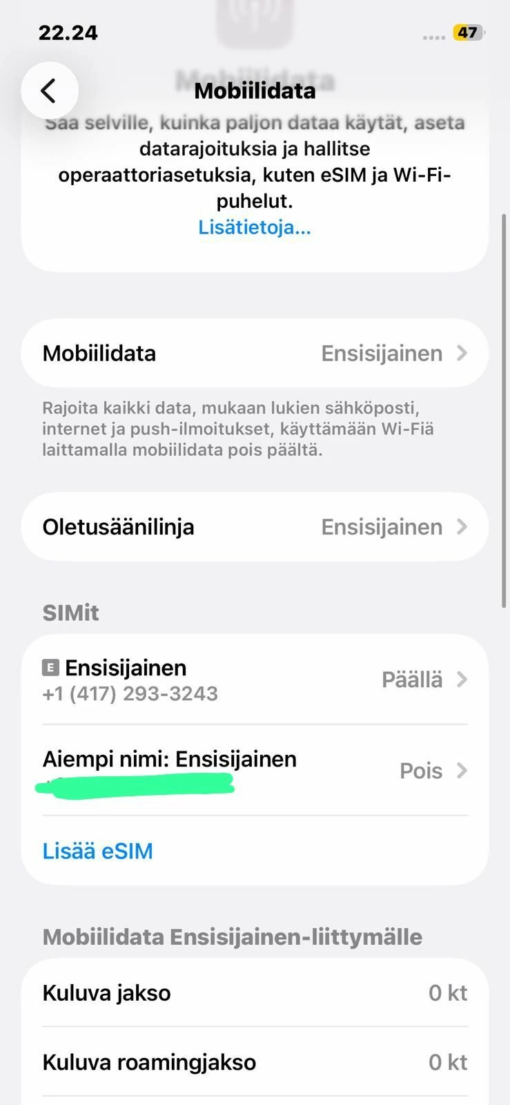Otimme uuden tyhjennetyn iPhone 12n ja siirsimme tiedot sinne. Tähän uuteen puhelimeen onnistui eSimin asentaminen ja puhelin toimi taas pari minuuttia normaalisti verkossa kunnes tuli Ei SIMiä. Asetuksissa mobiilidatassa kuitenkin näkyi, että Elisan eSim oli käytössä. Taas uudelleen käynnistämisellä sai verkon hetkeksi toimimaan. Lentotilassa käyttäminen ei auttanut. Verkon katkestessa ensisijaisesta eSimistä häviää mobiilidata-asetuksissa pieni harmaa e-kirjain edestä.