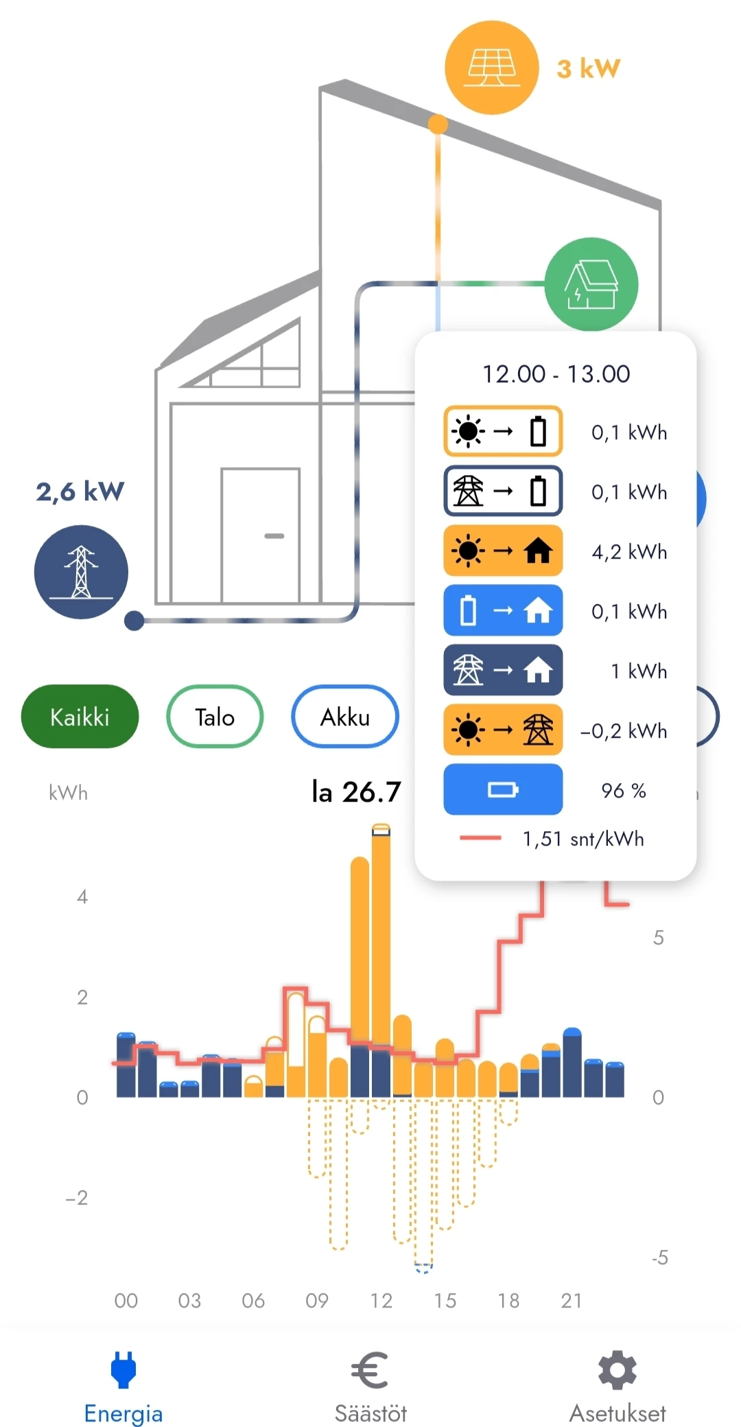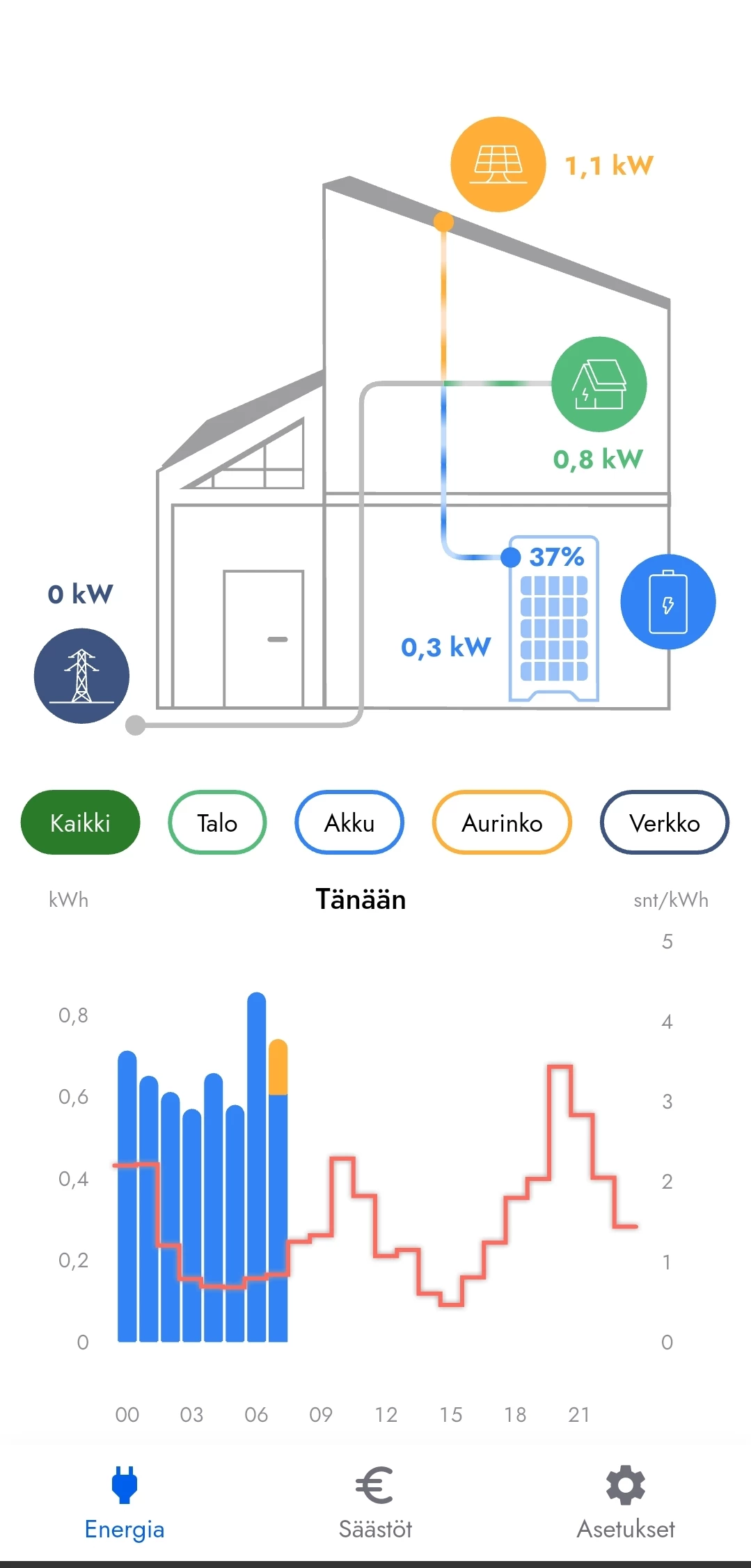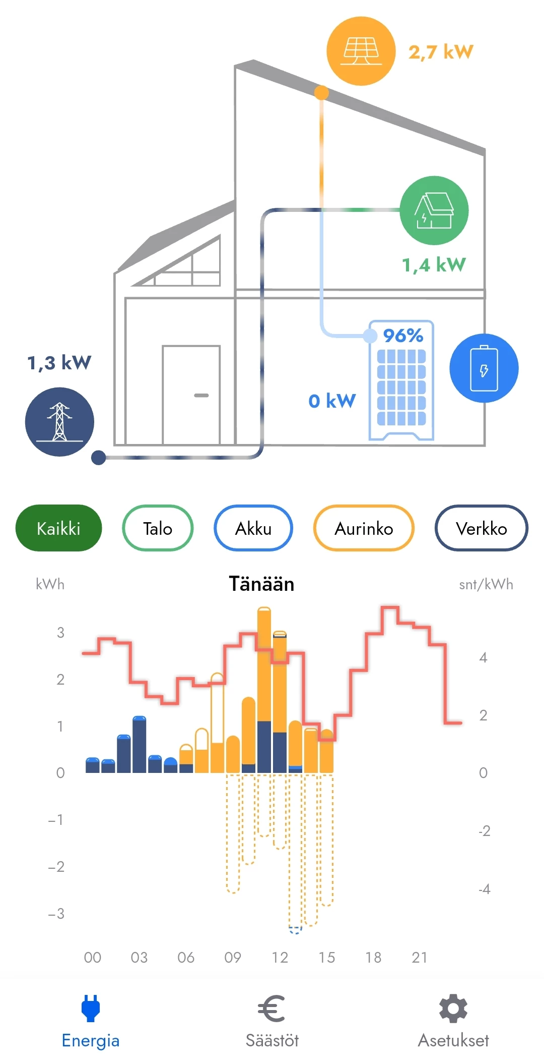 Viime viikolla kotiakulle tapahtui jotain. Siihen saakka se on ladannut ja purkanut akkua ihan tarpeen mukaan, mutta ei enää. Nyt ostetaan sähköä verkosta, vaikka akku olisi täynnä ja taivaaltakin tulisi lisää.
