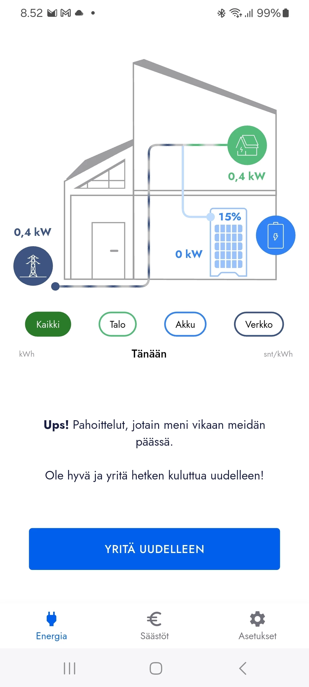 Tässä kohteessa oli ilmeisesti akku sammunut pois päältä. Pahoittelut, sitä ei oltu huomattu meidän päästä. Tällaisessa tapauksessa voisi olla parasta soittaa kotiakkuasiakkaiden asiakaspalvelunumeroon 010 190 400, niin tieto tavoittaa oikeat henkilöt nopeimmin. Hienoa, että ratkaisu löytyi tällä kertaa.