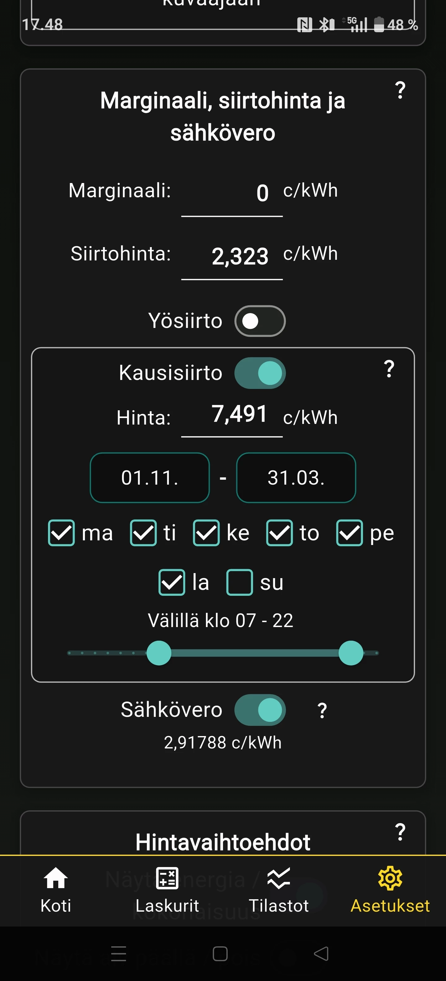 Nyt olisi minullekin akusto asennettuna ja jännittyneenä odotan ensimmäisiä datoja sovellukseen... Huomio jonka heti alkuun tein ja tahtoisin lisättävän on ettei siirtohinnastoon ollut mahdollista laittaa kausisiirtoa. Itse kun juuri sitä käytän. Nythän tietenkin kesäajan voin laittaa tiedot yleissiirron alle mutta talven tullen on taas arkipäivisin korkeampi siirtohinta mitä öisin ja sunnuntaisin. Tätähän se äppi ei osaa ottaa huomioon laskelmissaan.. joten tämmösen ominaisuuden/parannuksen tämä vaatisi.. mielellään ennen marraskuuta