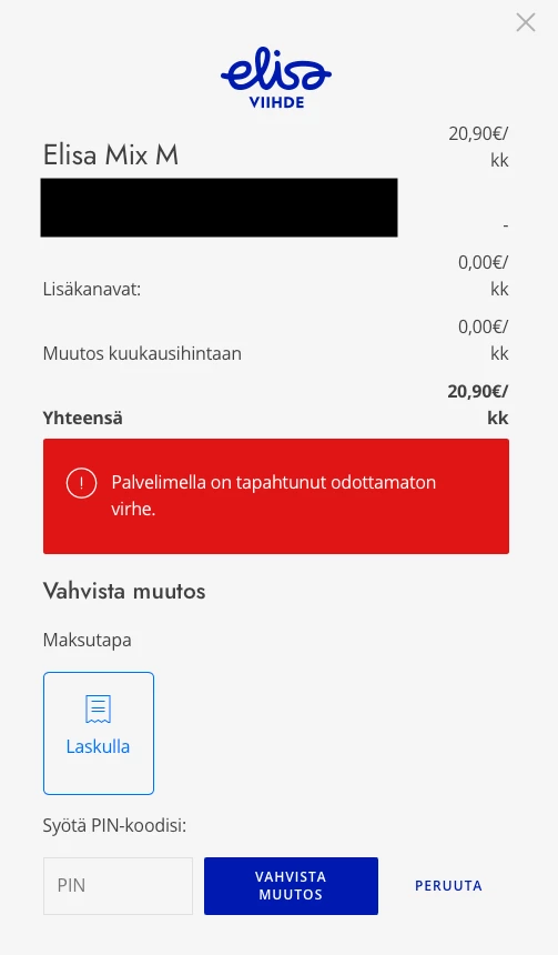 Kaikki menee mallikkaasti siihen asti että valitut kanavat käy hyväksymässä PIN koodilla, mutta tätä seuraa ilmoitus palvelinvirheestä. PIN koodi on varmasti oikein ja tarkistettu, koitin lopulta jopa vaihtaa sen toiseksi, sekään ei auttanut.