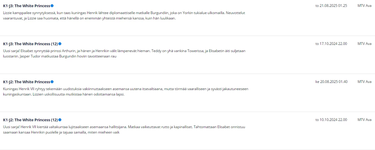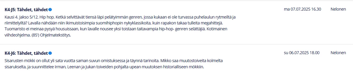 Nettisivulla näkyy nyt hienosti nuo kausi- ja jaksotiedot kaikilla kanavilla, mikä sinänsä on aiempaa parempi.
