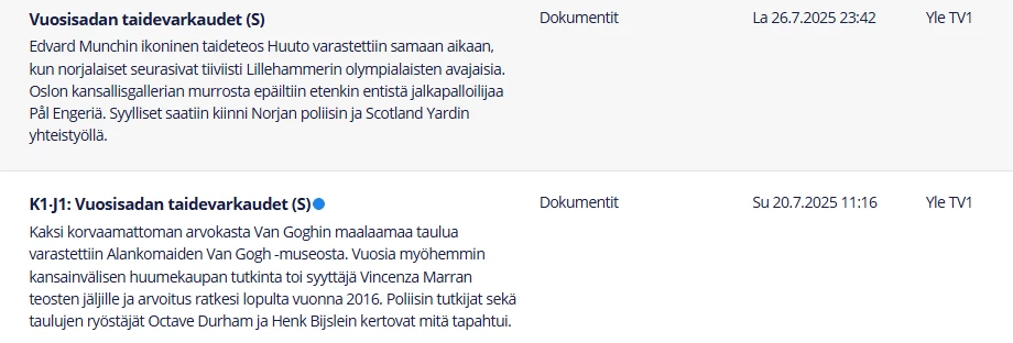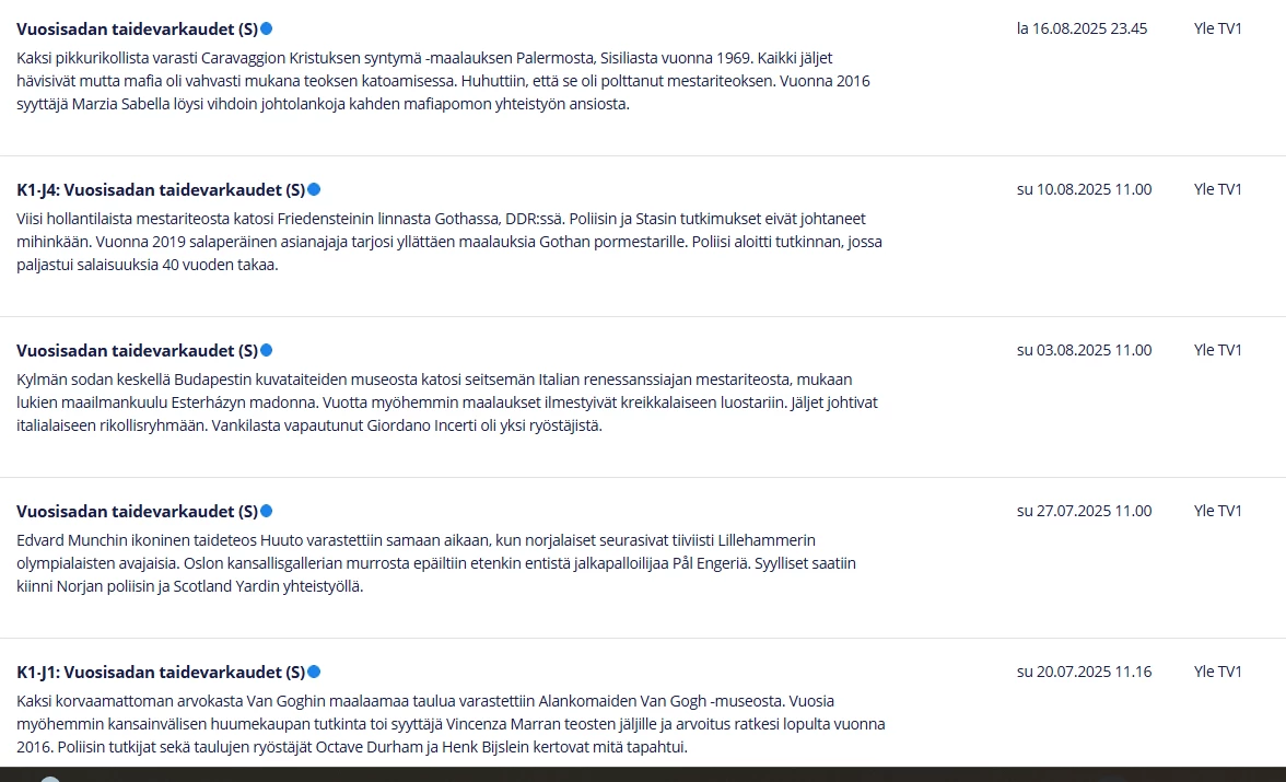 Ilmoitin näistä “Vuosisadan taidevarkaudet” ohjelman puuttuvista tiedoista eteenpäin suoraan datan toimittajalle.