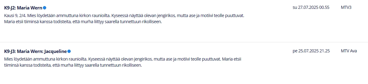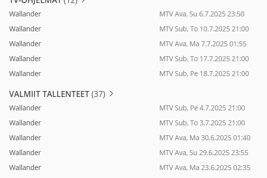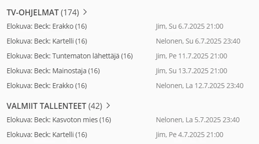 Tässä vielä malliksi Wallander- ja Beck-elokuvia eli miksi Wallandereissa ei näy nimiä, mutta Beckeissä näkyt? Nämä elokuvat tulevat uusintoina kerran vuodessa ja aina aikaisemmin Wallandereissakin nimet ovat näkyneet. Viimeksi Wallander-elokuvassa on ollut nimi 2.6.2025, jolloin suunnilleen nämä ongelmat ohjelmaoppaassa alkoivat eikä loppua näy; yli kuukausi on jo mennyt.