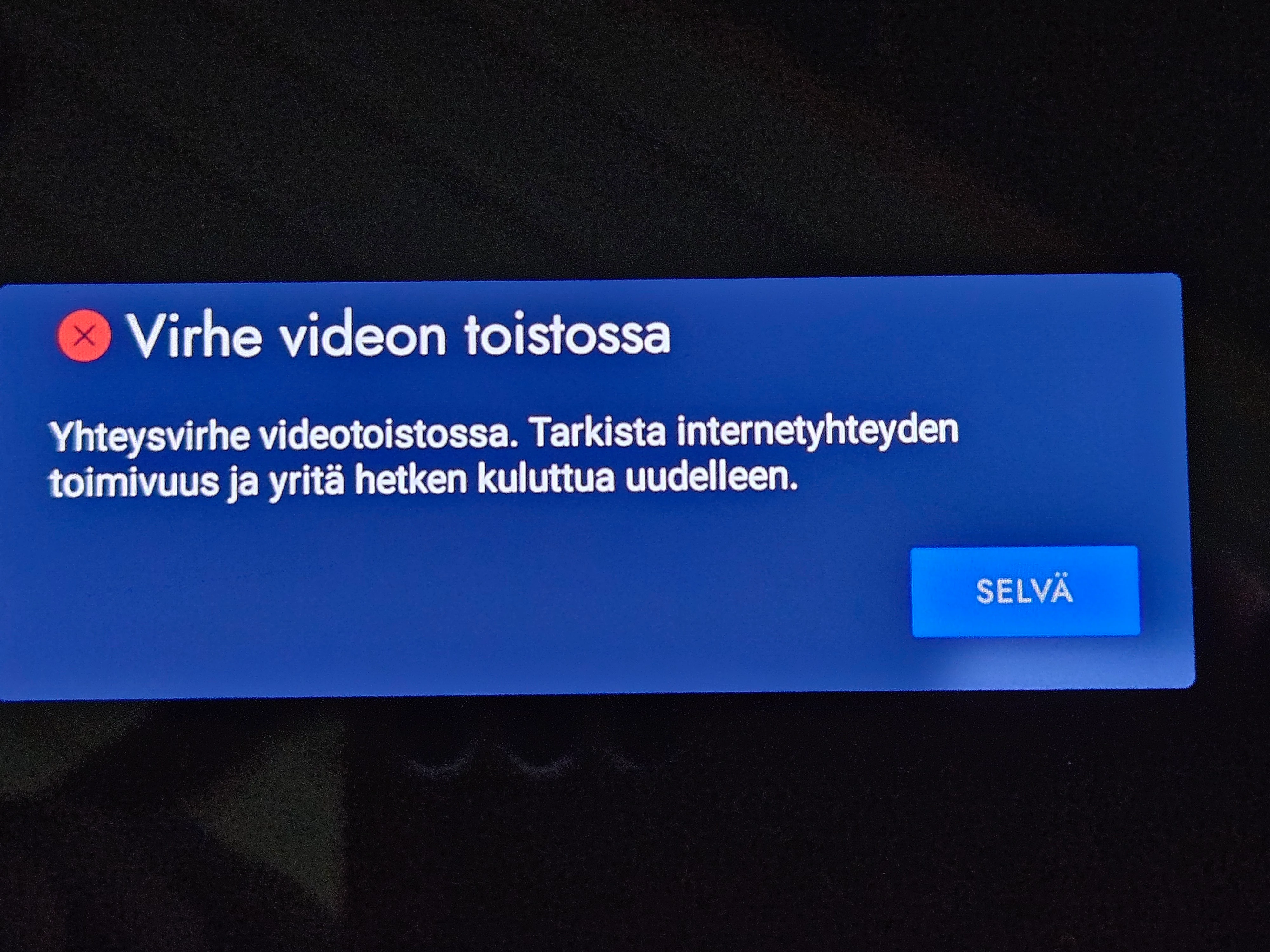 Yhteys toimii, testattu puhelimen hotspotinkin kautta varalta. Eli siinä ei vika pitäisi olla. Kotiyhteys on Telian 1/1G kuitu, joka on varalta kahdennettu Elisan 300G 5G yhteyden kautta. Ettei sekään nyt pitäisi olla ongelma, kun samaa nettiä käyttäen puhelimen (S23) Elisa Viihde app toimii ongelmitta.