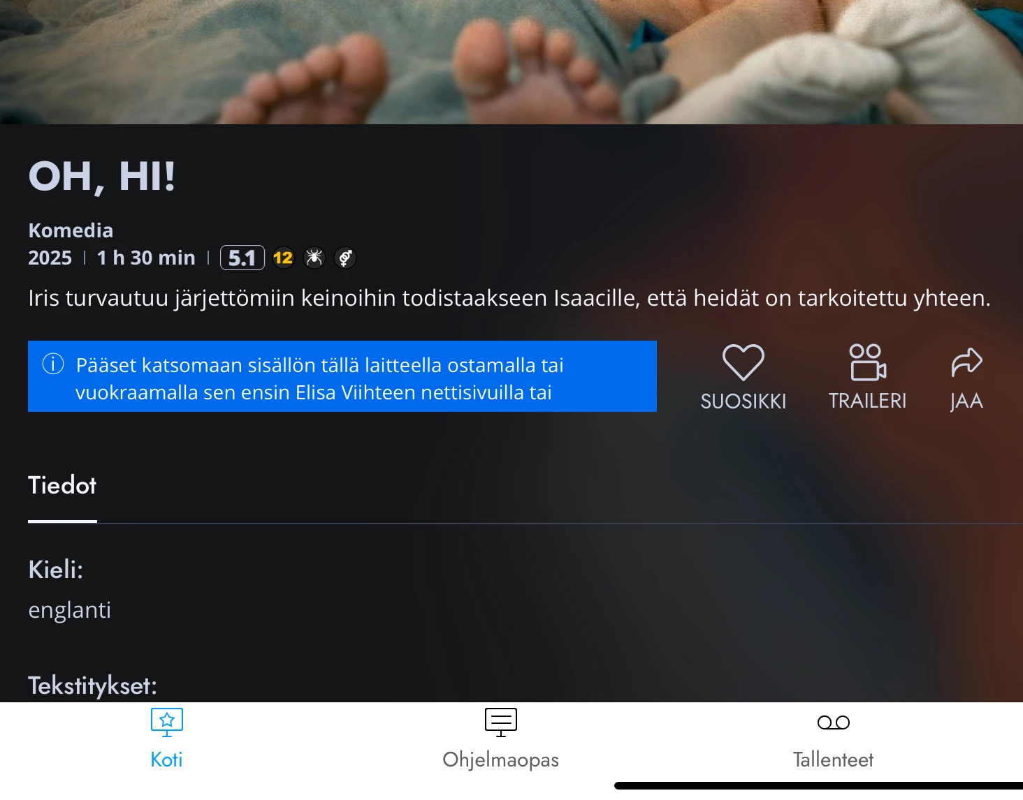 Hbo Maxin ohjelmien kohdalla Siirry-napin sijaan napissa lukee ’Pääset katsomaan sisällön tällä laitteella ostamalla tai vuokraamalla sen ensin Elisa Viihteen nettisivuilla tai’. Tai mitä?! Huolellista sekoilua sanoisin. (Mulla on tällä hetkellä Hbo Max tilattu toista kautta, muistaakseni aikoinaan kun sitä Elisalta tilasin niin siirtyminen Elisa Viihteestä Maxiin toimi asiallisesti.)