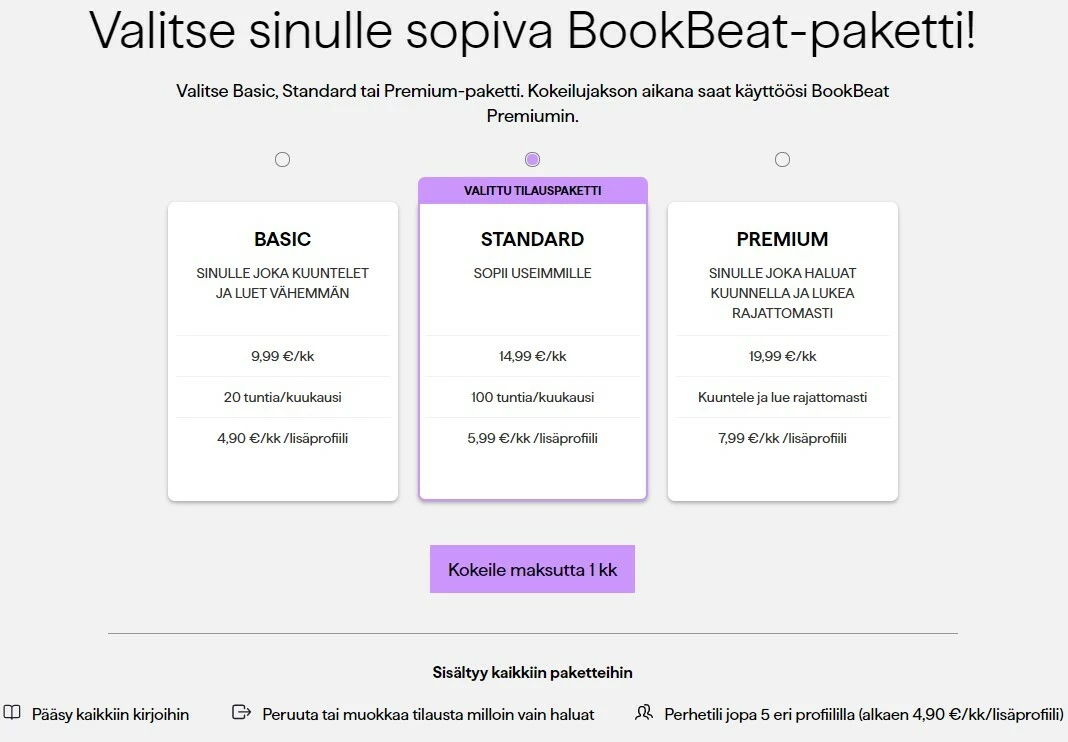 Esimerkiksi kilpailijalla BookBeatilla on useampi vaihtoehto kk tilaukselle jossa käyttäjä voi valita hänelle sopivan paketin ja miten paljon käyttää palvelua. Kaikille ei sovi tuo nykyinen rajaton 16,99 €/kk jotka ei paljoa käytä palvelua. Noissa vaihtoehdoissa voittaisi kaikki kun nekin jotka käyttää vähän palvelua niin voisi kans tilaa kyseistä palvelua. Pienemmät paketit on rajoitetumpia ja edullisempia kuin rajaton. Tuo nykyinen voisi säilyä ja sen rinnalle saisi halvempia vaihtoehtoja.