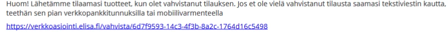 “Joissakin tilanteissa Elisa voi vahvistaa tilauksen puolestasi. Tästä kerrotaan sinulle myyntitilanteessa ja saat myös tekstiviestillä erillisen kuittauksen kun vahvistus on tehty.”