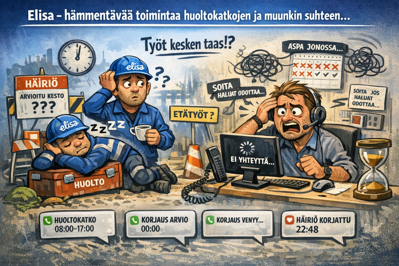 Ihmettelen tätä toimintaa, kun pitäisi saada tehtyä töitä ja näitä huoltotöitä tehdään päiväsaikaan ja jatkuvalla syötöllä. Luulisi Elisan olevan sen verran iso yhtiö, että nämä osattaisiin hoitaa kunnolla.