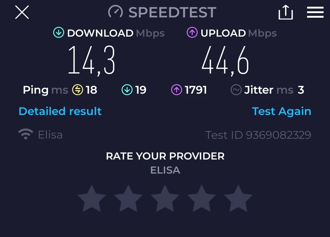 Kun tekee speedtestin niin nopeus on 20 luokkaa ja usein allekkin. Jos testiserverinä käyttää Elisan omaa serveriä niin silloin nopeus näyttää olevan kunnossa 😂. Todellisuudessa nopeus on kuitenkin todella alhainen kun maksaa 150/50 nopeudesta.