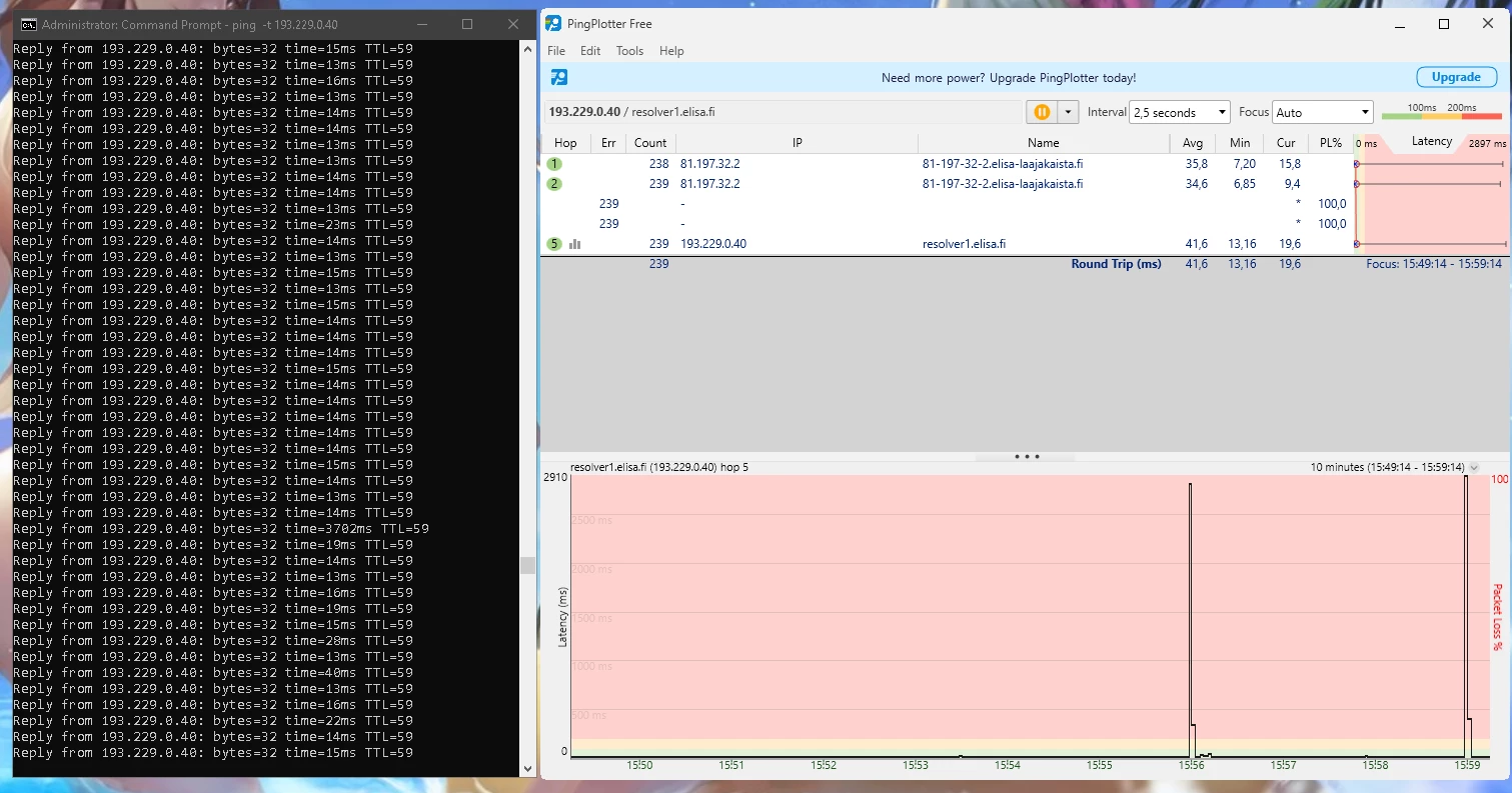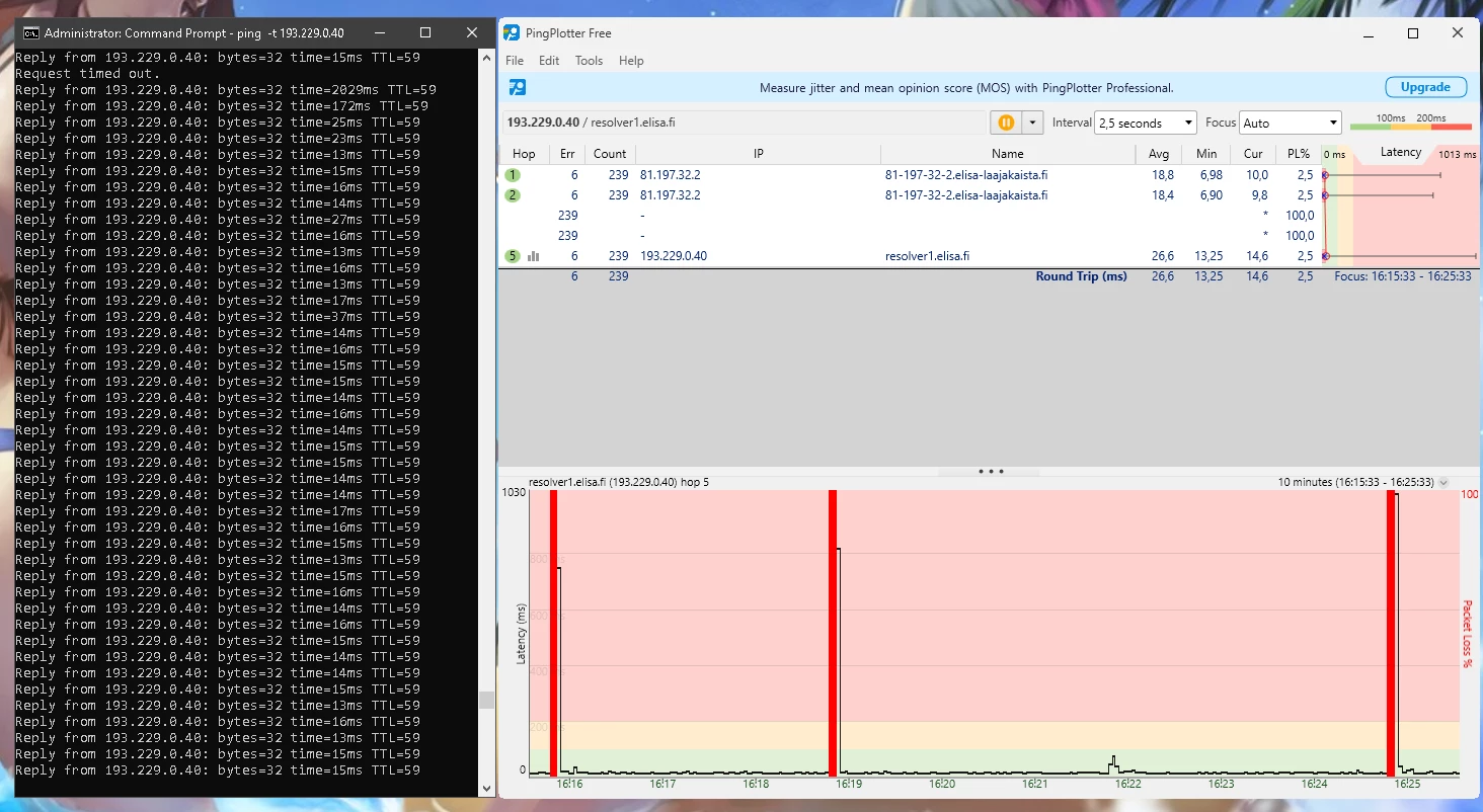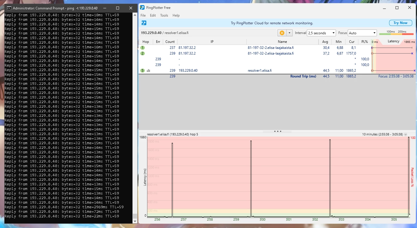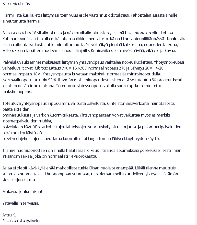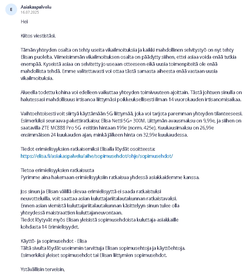Ja nämä häiriöt jatkunee kohta 2 vuotta. Omalta osalta on kaikki mahdollinen kokeiltu eikä ole korjaantunut. Olisi kiva tietää miksi asiakaspalvelu vaan jarruttaa asiaa eikä yritä auttaa millään lailla vaa tarjoaa irtisanomista tai vaihtamista 5G:hen.