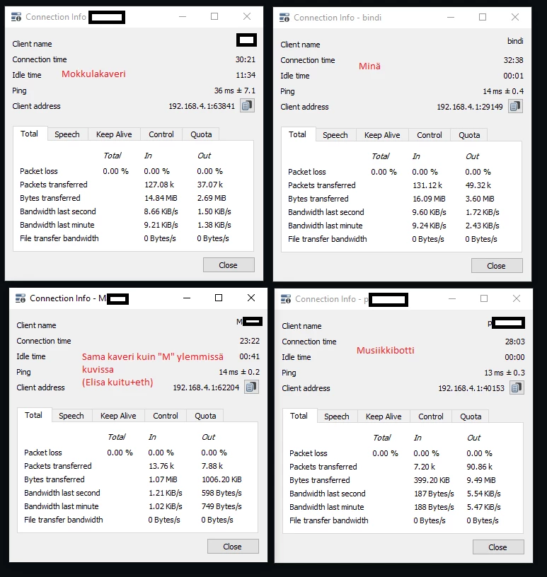 Ongelmana kuitenkin on se, että välillä kenen tahansa käyttäjän ääni pätkäisee kesken lauseen, emme kuule häntä, eikä hän meitä. “Blackout” kestää n. 5-10 sekuntia. Tämä ei ole siis vain yksittäisen käyttäjän ongelma, vaan tulee yksi kerrallaan satunnaisesti jokaiselle käyttäjälle. Tätä on jatkunut ainakin vuoden, sanoisin siitä asti kun talojakamoon saatiin vaihdettua gigainen kytkin 100M Ciscon tilalle (josta minulla on täällä omayhteisössä ollut jo oma tappelulanka, VOAS&Elisa&Voimatel). En ole vain jaksanut selvittää ongelmaa, kun oletin vian olevan laitteistossani ja turhautuneena jatkoin maksullisen Hetzner-palvelimen käyttöä. (kyseinen ongelma on täysin poissa kun samat käyttäjät ovat Hetznerin palvelimella!)