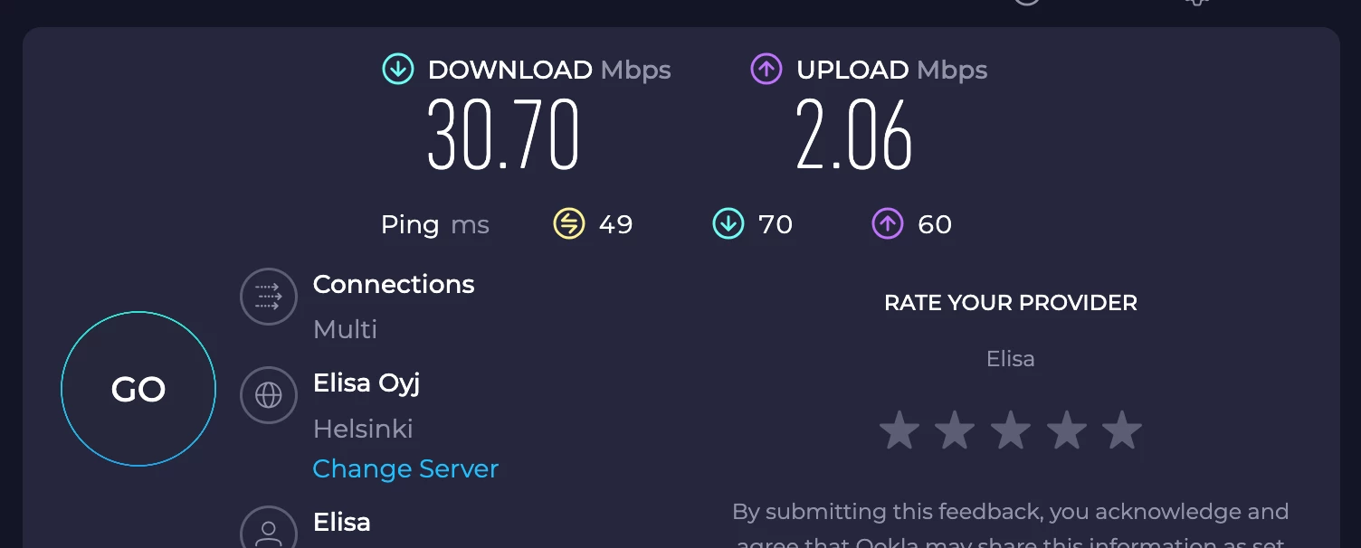 Kohta 10 vuotta on kärsitty huonosti toimivasta Elisa laajakaistasta. Elisa teki sopimuksen taloyhtiömme kanssa ja muka tarjoaa 100/10 Mbits yhteyden joka kuuluu vuokraan. Todellisuudessa yhteys on hyvän jos on 60/6 Mbits, joskus upload nopeus putoa jopa alle 2 Mbits. Eli liittymä on käytännössä käyttökelvoton, jos haluaa striimata, lähettää videoita youtubeen, varmuuskopioda dataa pilveen tai tehdä etätöitä.