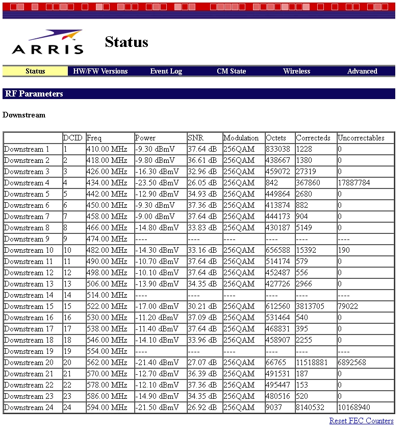 RF parametreissä näkyy kanavilla 4, 20 ja 24 hirveä määrä korjattuja ja korjaamattomia, kanavat 9, 14 ja 19 on ilmeisesti pimeinä. Olisiko kellään mitään vinkkiä kuinka lähtisi tätä korjaamaan?