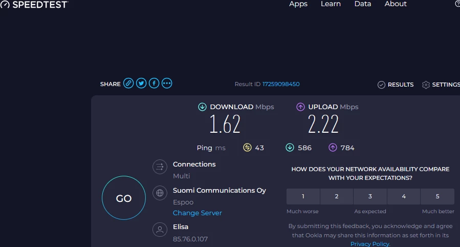 Elisa kertoo että meillä olisi hyvä nettiyhteys kuitenkin SpeedTesti näyttää ihan muuta, miksi Elisa ei ymmärrä että jotain tulee tehdä, ulkoinen lisäanteeni vai?? Yle Areena menee välillä pimeeksi jos samaan aikaan käyttää tietokonetta ja tiedostojen kopiointi netistä kestää tuteja kun se muilla kestää muutamia minuutteja. Olemme ilmoittaneet Elisa asiakaspalveluun mutta sieltä mitattan tod.näk. vain tukiasemalta lähtevä nopeus.
