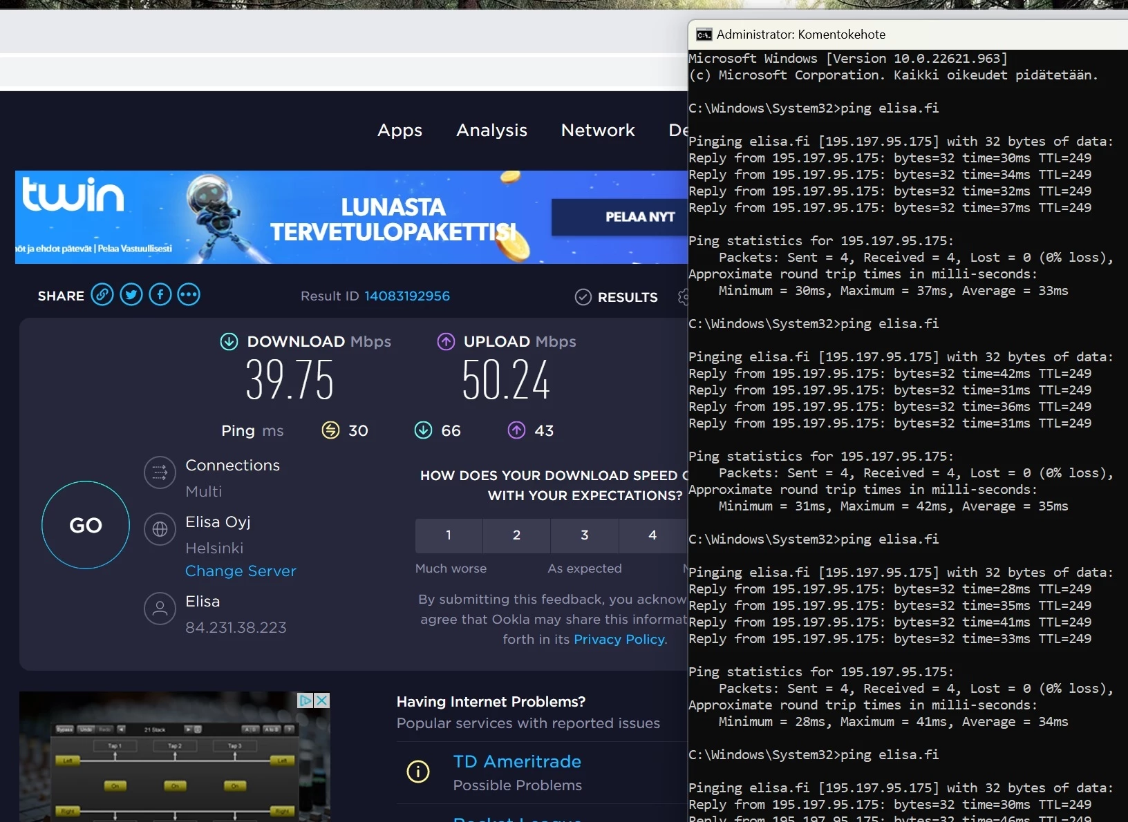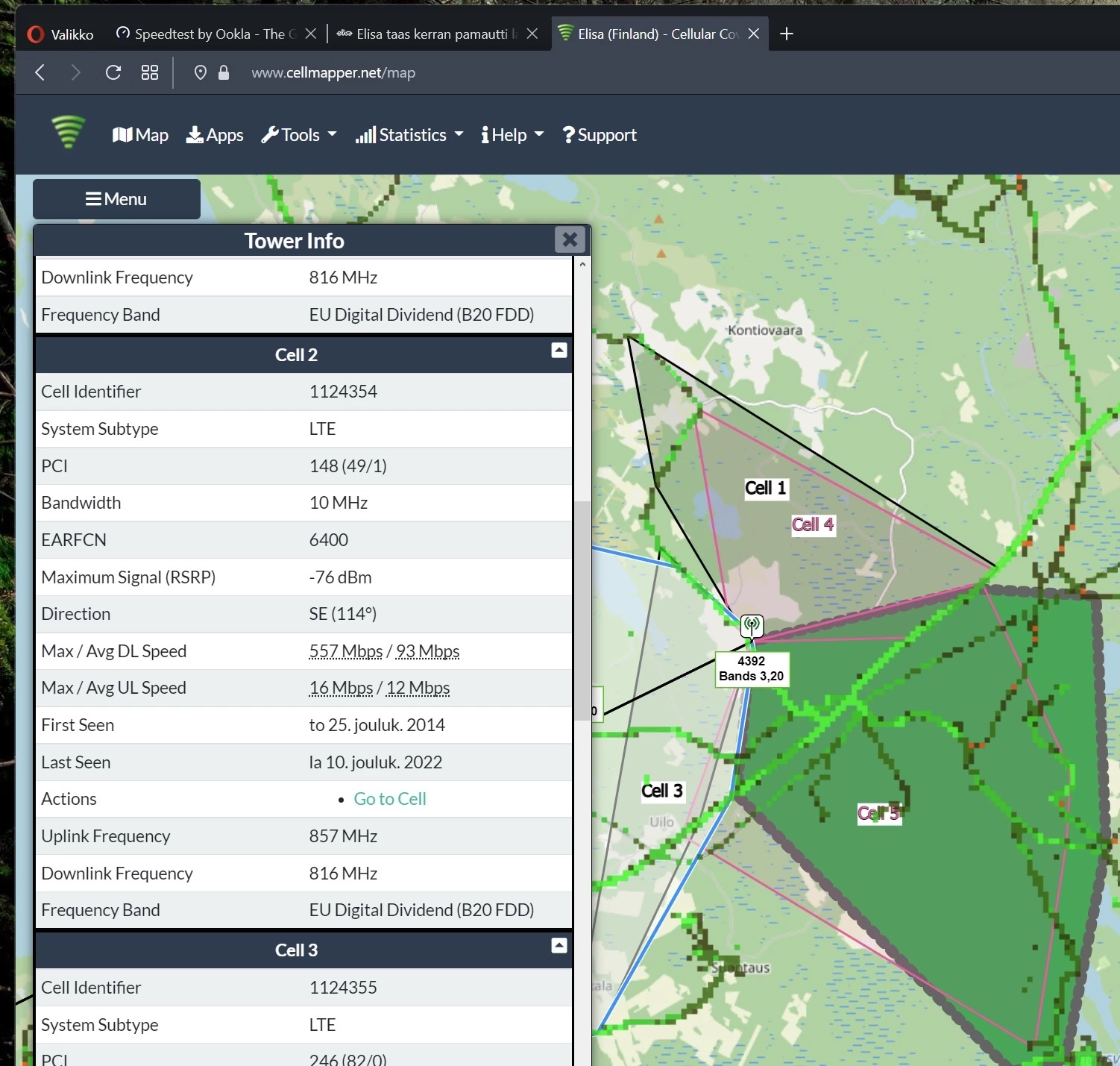 Kun pingi on jo Suomeen, ja suoraan Elisalle jopa 130ms niin täyttä hampaiden kiristelyähän tämä ollut viimeiset 3 kuukautta. Katsoin tuolloin Cellmapperilla että oli tosiaan mastoani päivitelty.