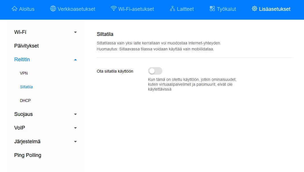 Saako Huawei cpe H155-382 reitittimen asetettua Elisan firmiksellä siltaavaan tilaan kuten käytössäni oleva ZTE-MC7010 on? Ei tahdo löytyä kunnon ohjeita mihin H155-382 laite pystyy Elisan firmiksellä.