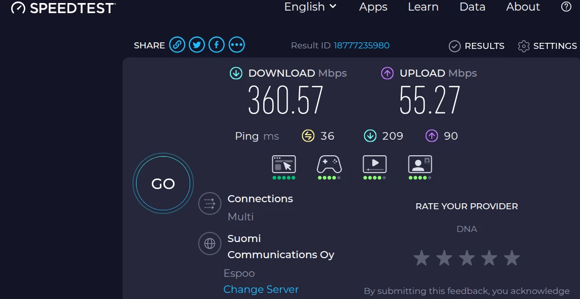 Download 57Mb, Upload 21,8 Mb, ping 19. Joskus silti vain luokkaa Down 8,66, up 1,73 ping 75, eli iso vaihtelu.