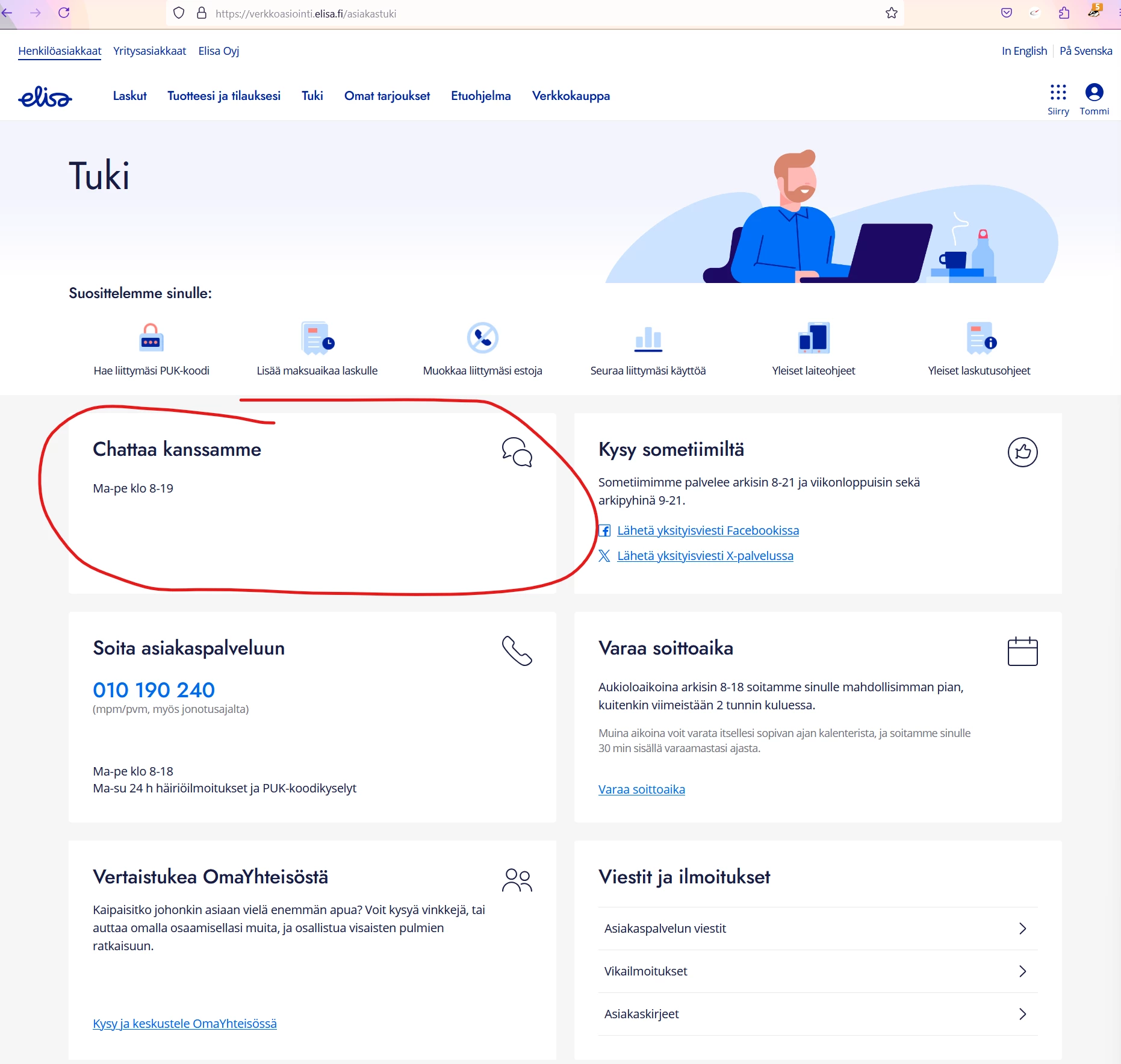 Ja toinen parannuskohde: Miten voin parhaiten elisan omien nettisivujen toiminnasta ilmoittaa? En löytänyt mitään valikkoa tai linkkiä 15 minuttin etsimisellä. Tämän pitäisi löytyä selkeästi tuki-sivuilta ja/tai joka sivun alalaidasta, kuten yleisesti on tapana.