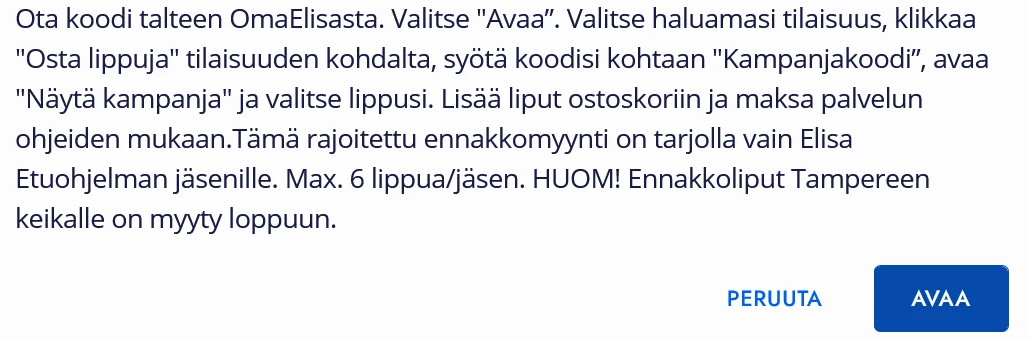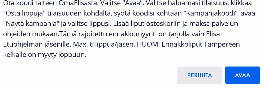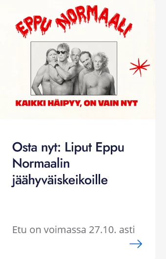 Legendaarinen Eppu Normaali heittää jäähyväiset kahden 50-vuotisjuhlakeikan voimin. Helsingin Bolt Arenan 6.6 ja Tampereen Ratina Stadionin 8.8. esiintymiset ovat bändin viimeiset keikat ikinä. Elisa Etuohjelman jäsenenä sinulla on tilaisuus hankkia liput näille unohtumattomille keikoille ennen muita. Ennakkomyynti alkaa 24.10. klo 9.00 ja jatkuu 27.10. klo 12.00 asti tai kunnes ennakkoliput loppuvat. Ennakkokoodin löydät OmaElisasta. Max. 6 lippua/koodi. Tämä rajoitettu ennakkomyynti on tarjolla vain Elisa Etuohjelman jäsenille.