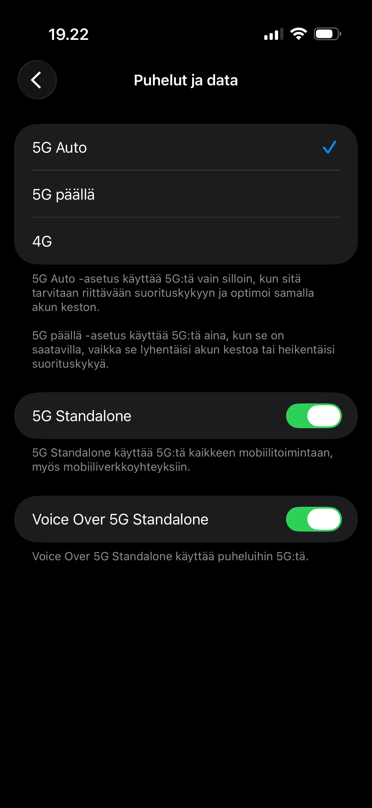 Voitteko vielä tarkentaa mitkä asiat ei toimi samanaikaisesti? Ainakin itsellä iPhone on Field Test Moden perusteella iloisesti SA-tilassa ja mobiilivarmenne toimii ilman mitään ongelmia. Käytössä on eSim jos se asiaan mitään vaikuttaa.