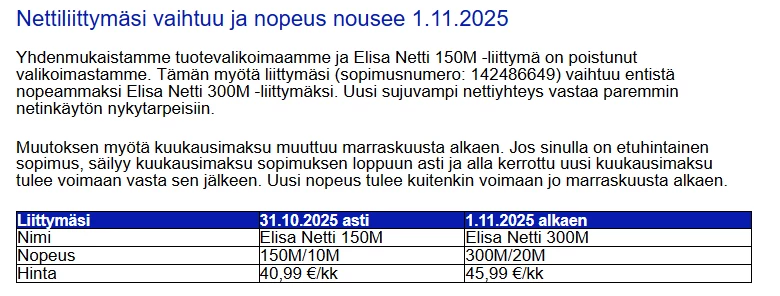 Onko niin, että operaattori voi vaihtaa sopimushintaa kesken kauden, vaikka kilpailutuksessa on sovittu 24kk sopimushinta? Tälläinen sähköposti oli minulle tullut, eikä ole kyllä aikaisemmin tullut mieleenkään, että tuollainen olisi mahdollista. Ymmärrän kyllä alv-muutoksen, mutta että tuodaan tarpeettomia lisäpalveluja ja yksipuolisesti nostetaan hintaa. Astuu voimaan tosin vasta syksyllä, eli onneksi ELISA:lla on aikaa tuollainen muutos vielä perua. Isoista rahoista ei ole kysymys, mutta toimintatapa on jotenkin outoa nykypäivänä luotettavaksi tunnetulta toimijalta.