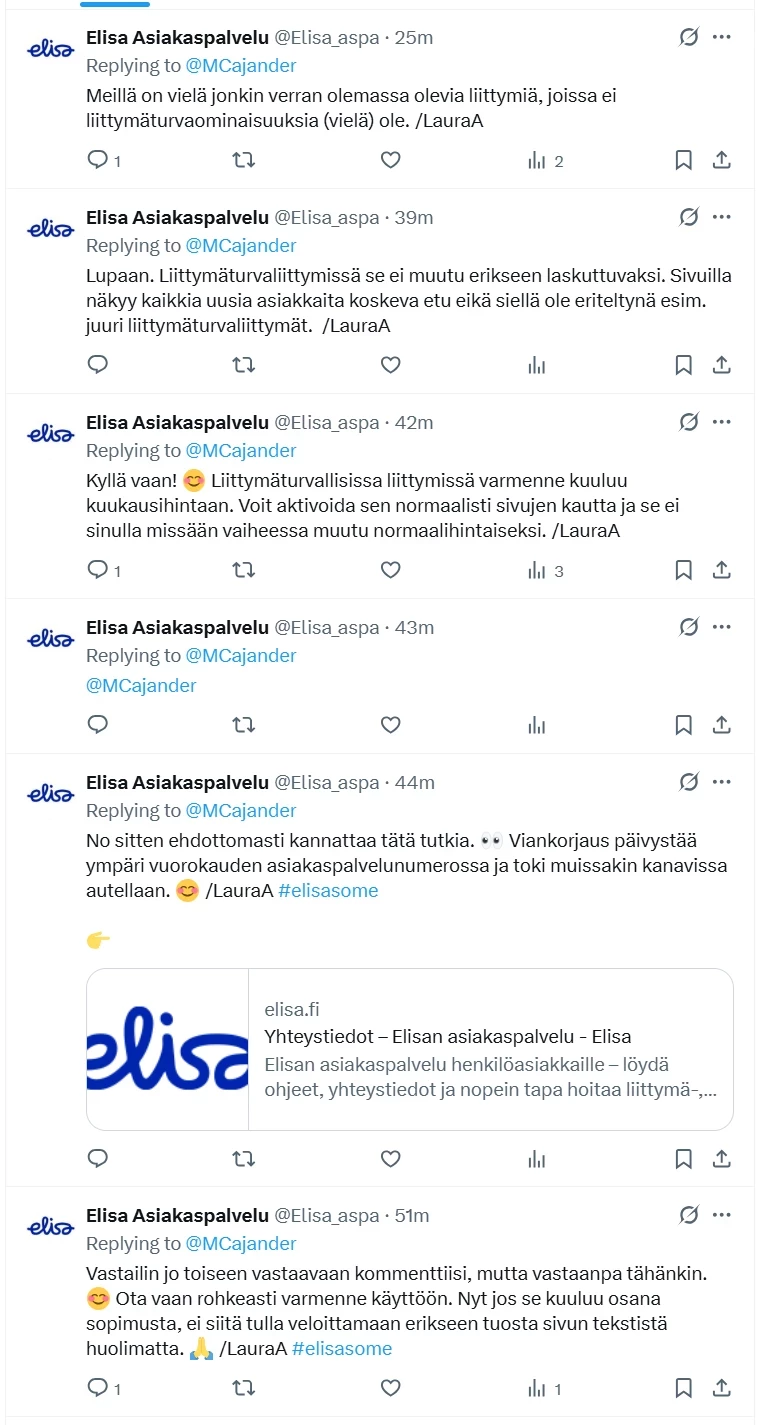 No niin. X:ssä ollaan käyty tätä keskustelua eli Elisan myyjä sanoi että mobiilivarmenne kuuluu uuteen Elisan liittymään minkä hän minulle möi ja sitten selkeästi Elisan sivuilla sanotaan että kaikkiin uusiin liittymiin sisältyy mobiilivarmenne: https://elisa.fi/tietoturva/mobiilivarmenne/ mutta nyt näyttää siltä ettei sisällykään eli molemmat suorastaan valheita!?