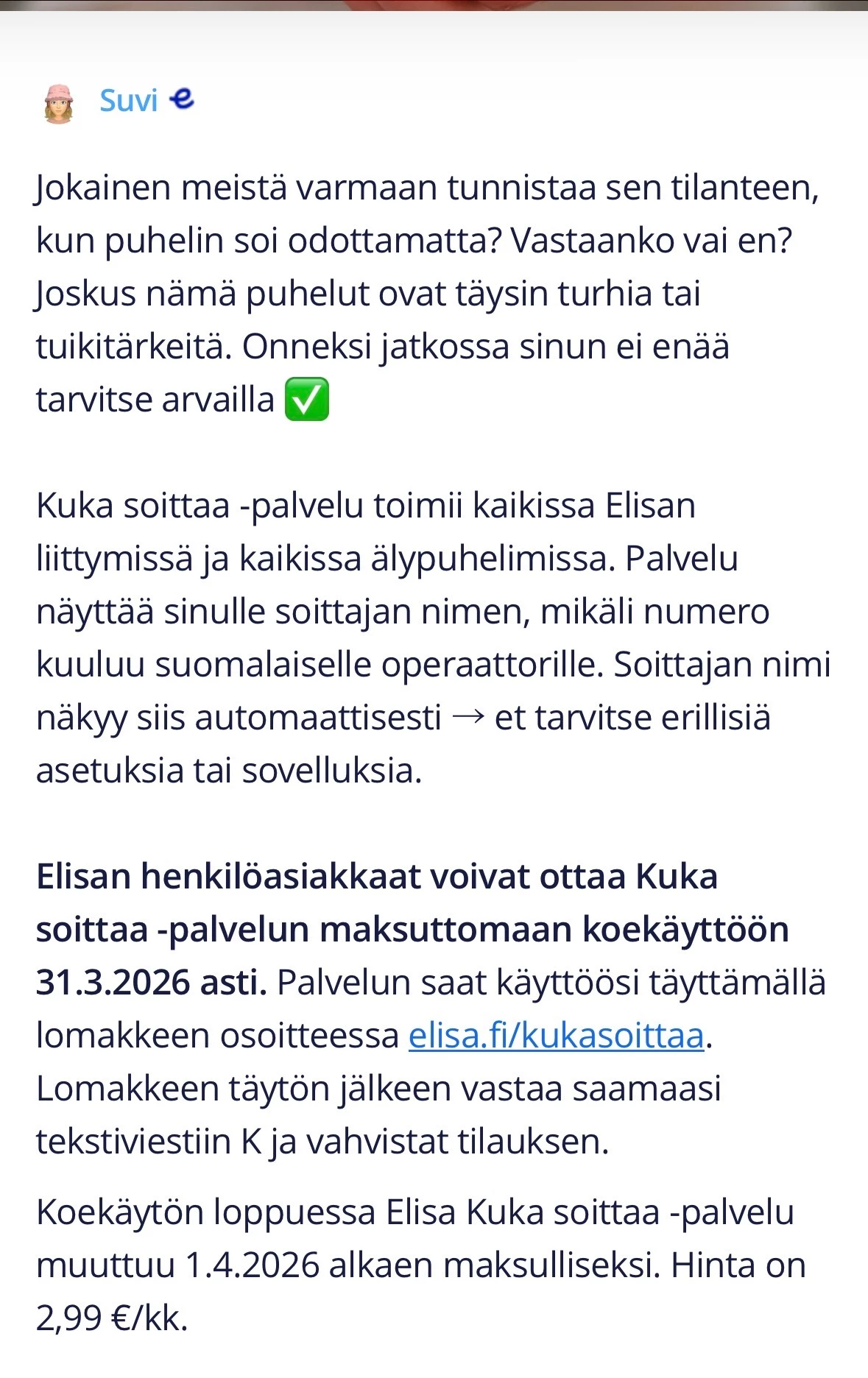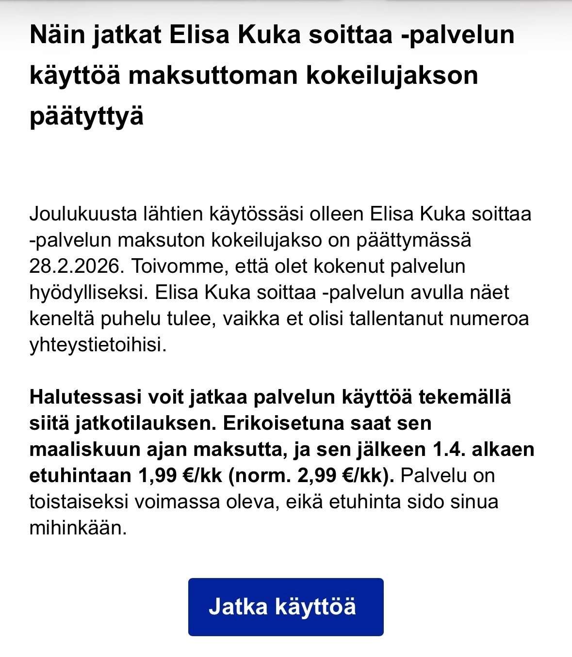Koekäytön loppuessa Elisa Kuka soittaa -palvelu muuttuu 1.4.2026 alkaen maksulliseksi. Hinta on 2,99 €/kk.