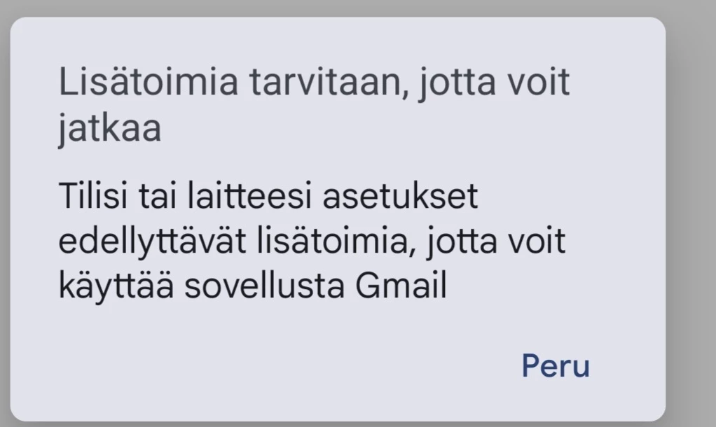 Aivan ykskaks yllättäen Gmail-äppi ei päästä lukemaan elisa-sähköposteja vaan läväyttää esteen.