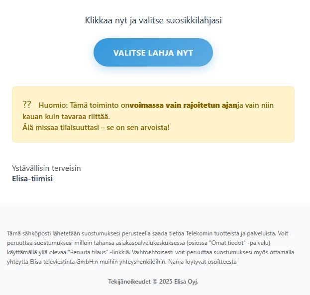 Sain juuri sähköpostia Elisa Oyj Asiakaspalvelusta ja se kuului seuraavasti: