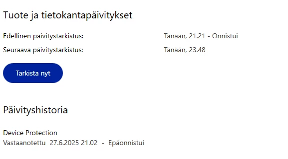 Windows 10:lla pyörivä Elisa Tietoturva ohjelma ei onnistu päivittämään virustietokantoja. Tarkista nyt nappi kyllä tekee aloittaa tarkistuksen ja päivittää milloin se on viimeksi tehty, mutta sen alapuolella oleva päivityshistoria kertoo hetken päästä käsittelyn epäonnistuneen.
