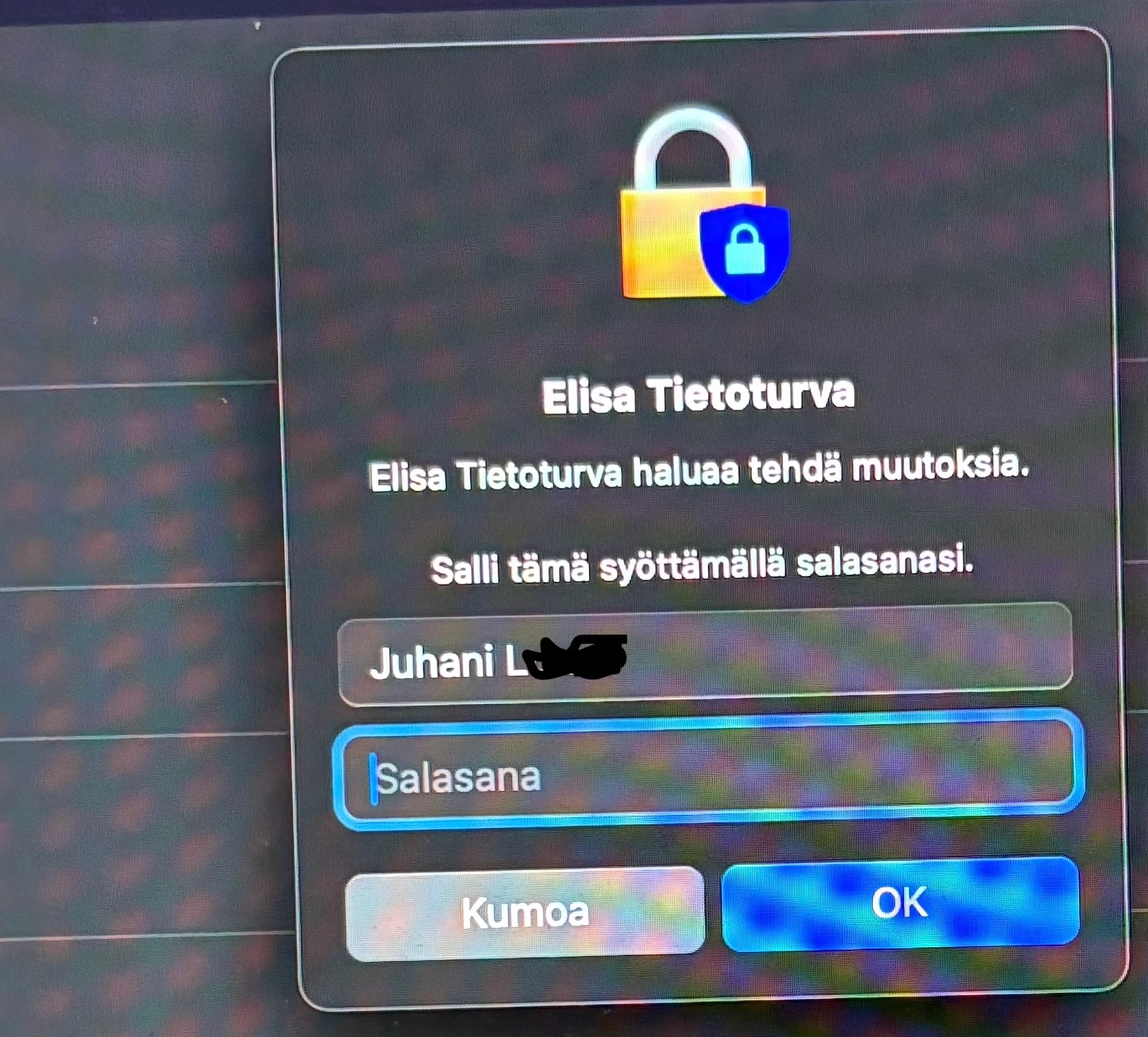 Elisa tietoturva kysyy salasanaa, käyttäjätunnuksena on valmiiksi mun etunimi ja sukunimi .Mikään ei tunnu kelpaavan ( Oma elisa ym…. ) Olisin tyhjentänyt “tapahtumat” kohdan.
