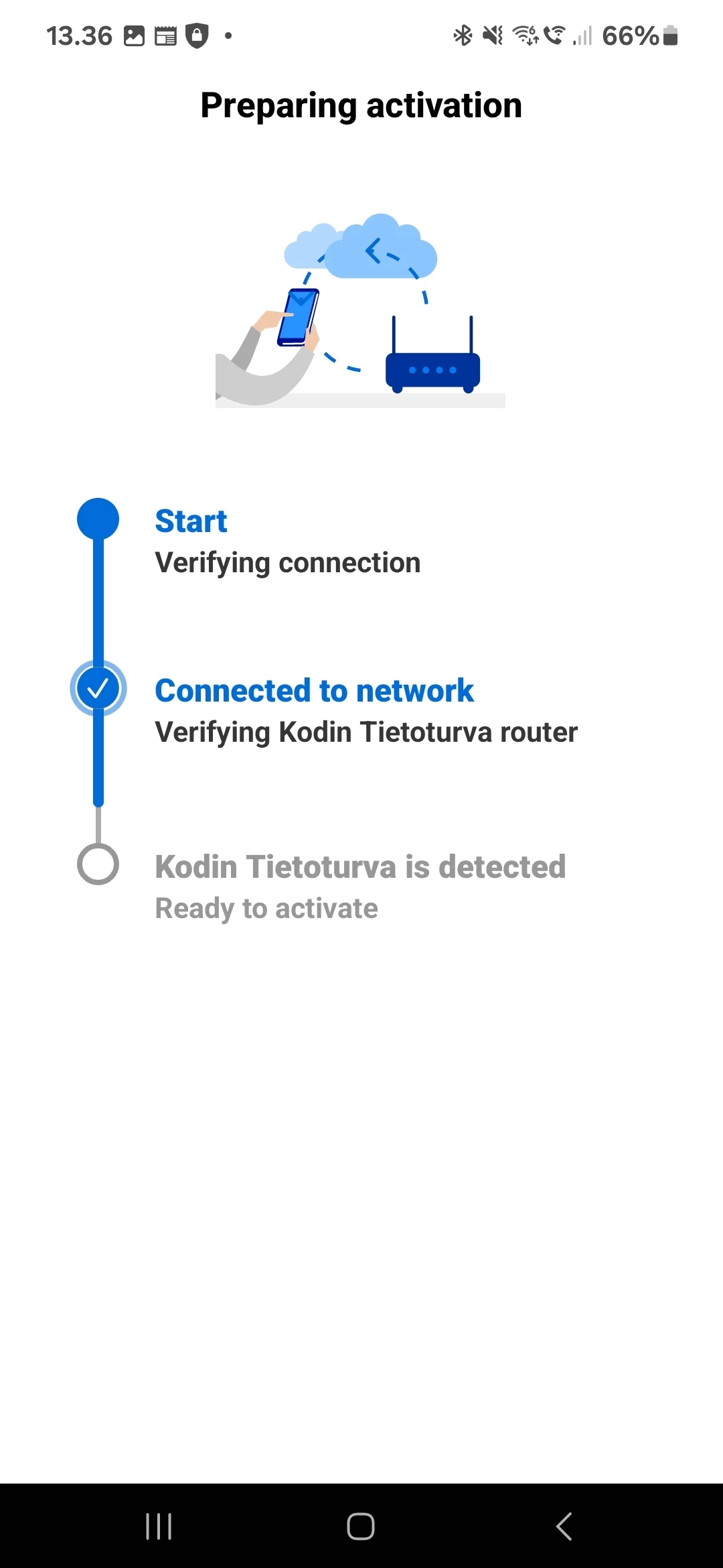 Sovellus aluksi valmistelee aktivointia, yhdistää verkkoon ja sininen viiva menee loppuun asti viimeisenkin kohdan alkukohdalle (Kodin tietoturva on havaittu) mutta sitten pamahtaa ilmoitus että